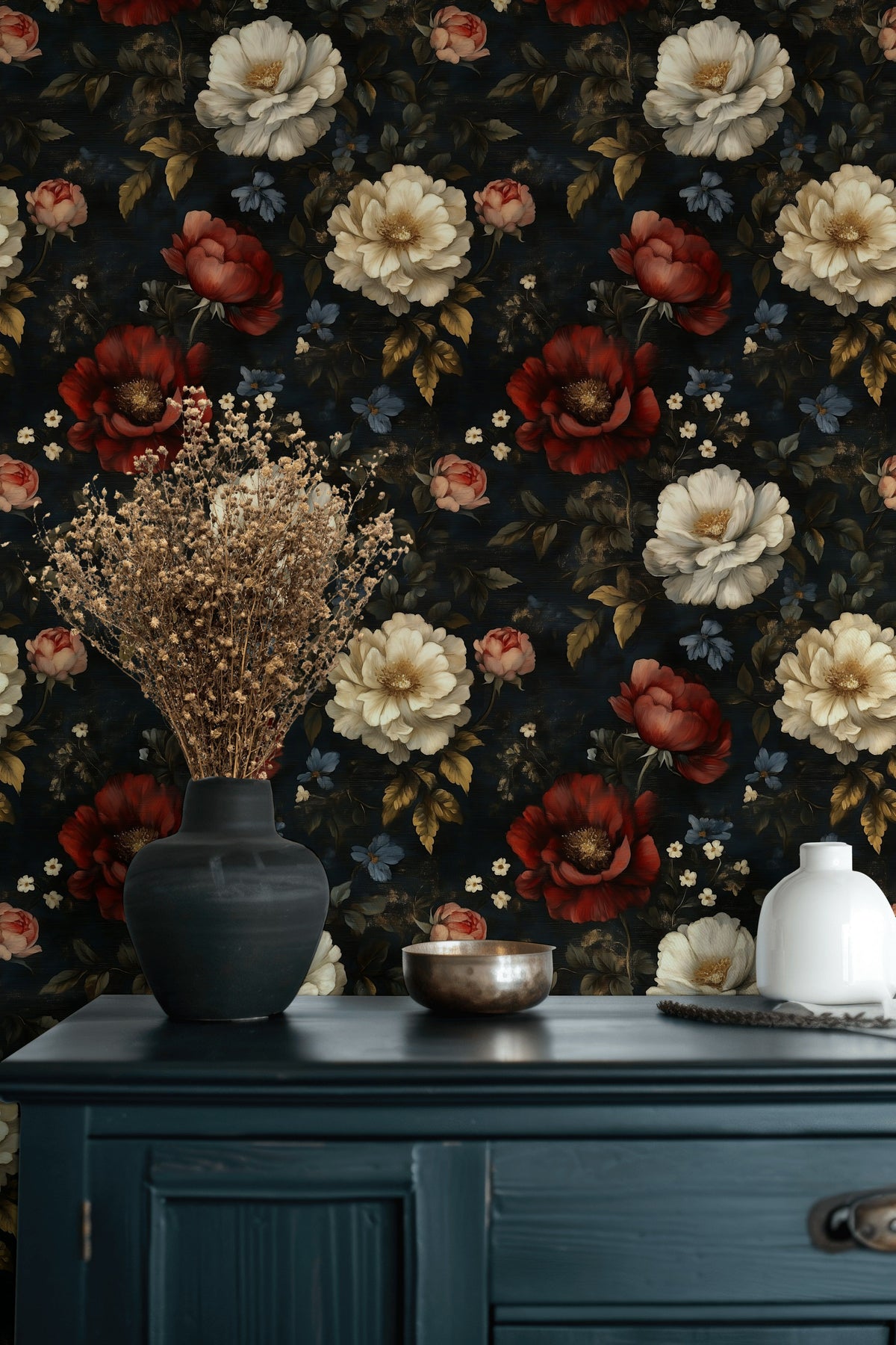 The key to matching the Vintage Dark Floral Rose Pattern Wallpaper with modern decor is to balance its bold floral design with minimalist furnishings. Opt for furniture in neutral tones or metallic accents to enhance the wallpaper's luxurious and vintage appeal.