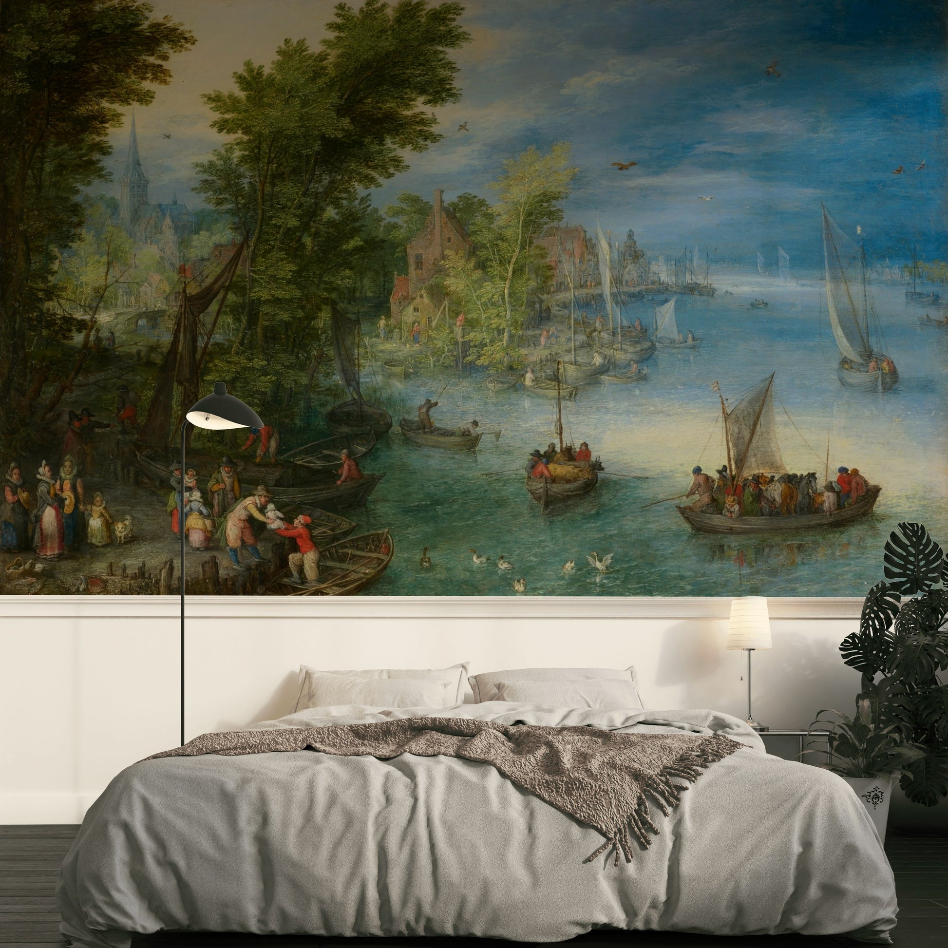 This wallpaper features a Dutch village mural filled with storybook charm, from riverside boats and tall trees to gabled rooftops and a busy harbor scene. Painted in a classic vintage art style, the mural’s blue wall tones and historical countryside detail create an old world look, evoking the waterside life of another era. Fine brushwork and a bright sky make this wallpaper a standout for traditional and classic interiors.