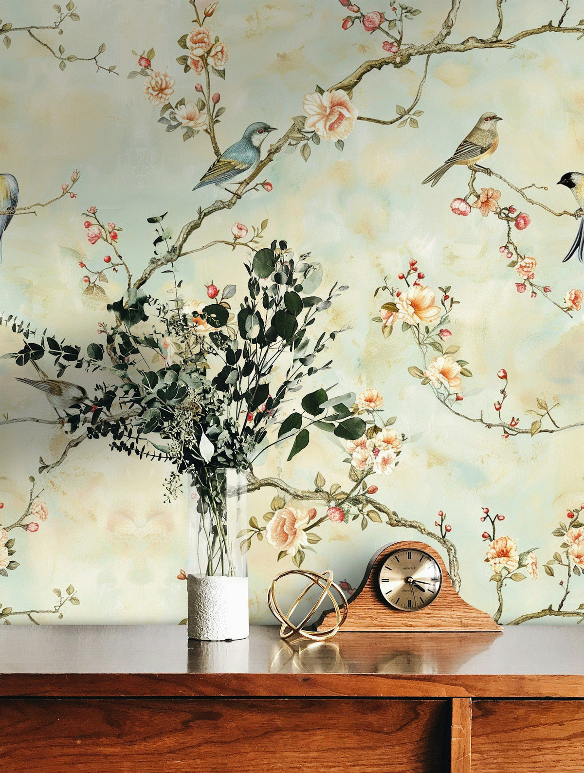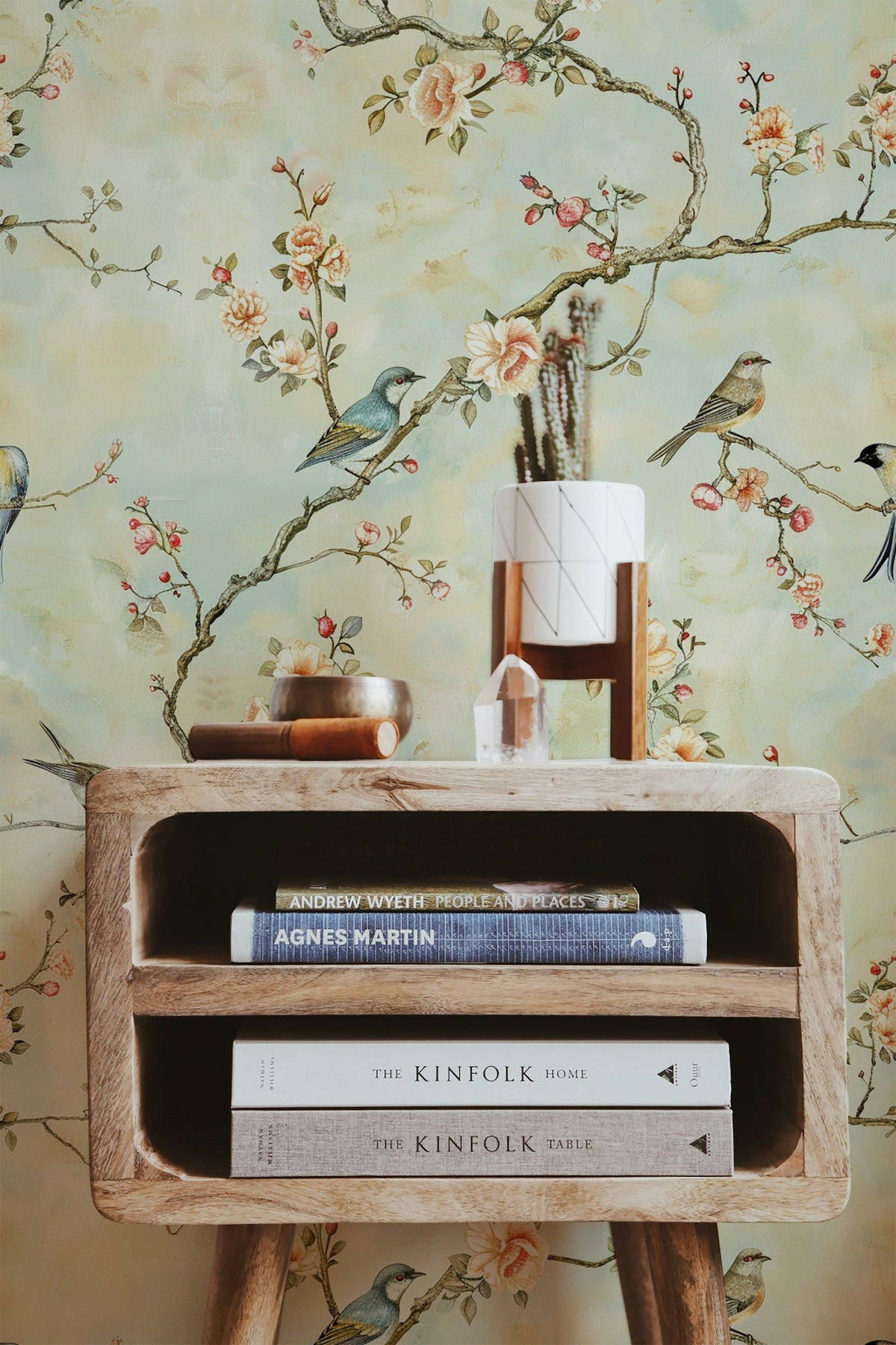 Creamy branches adorned with cherry blossoms and perched birds sweep across a pale background, their details captured with a painterly touch. Ideal for living rooms and bedrooms, this wallpaper brings a soothing natural element indoors. The gentle tones reflect light softly, enhancing a calm and inviting atmosphere. Ideal for bohemian and modern interiors, it complements wicker, natural woods, and pastel accents beautifully.