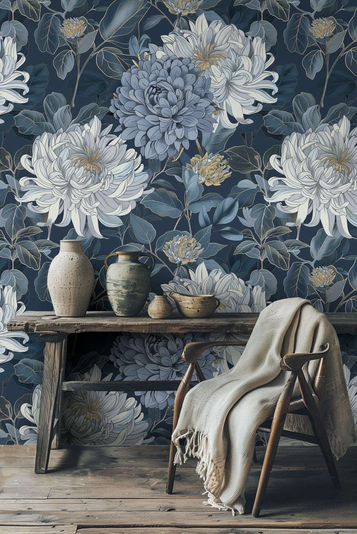 Luxurious large-scale floral motifs in shades of blue bloom across a rich midnight black background, creating a striking visual impact. The intricate details of the petals and leaves lend a touch of elegance to any modern space, making this wallpaper a perfect choice for a bold statement wall. Ideal for living rooms, bedrooms, or hallways, this wallpaper adds depth and character. Its dark tone enhances low-light settings, offering a sophisticated ambiance. Complements modern luxury interiors, pairing beautifully with contemporary furniture and metallic accents.