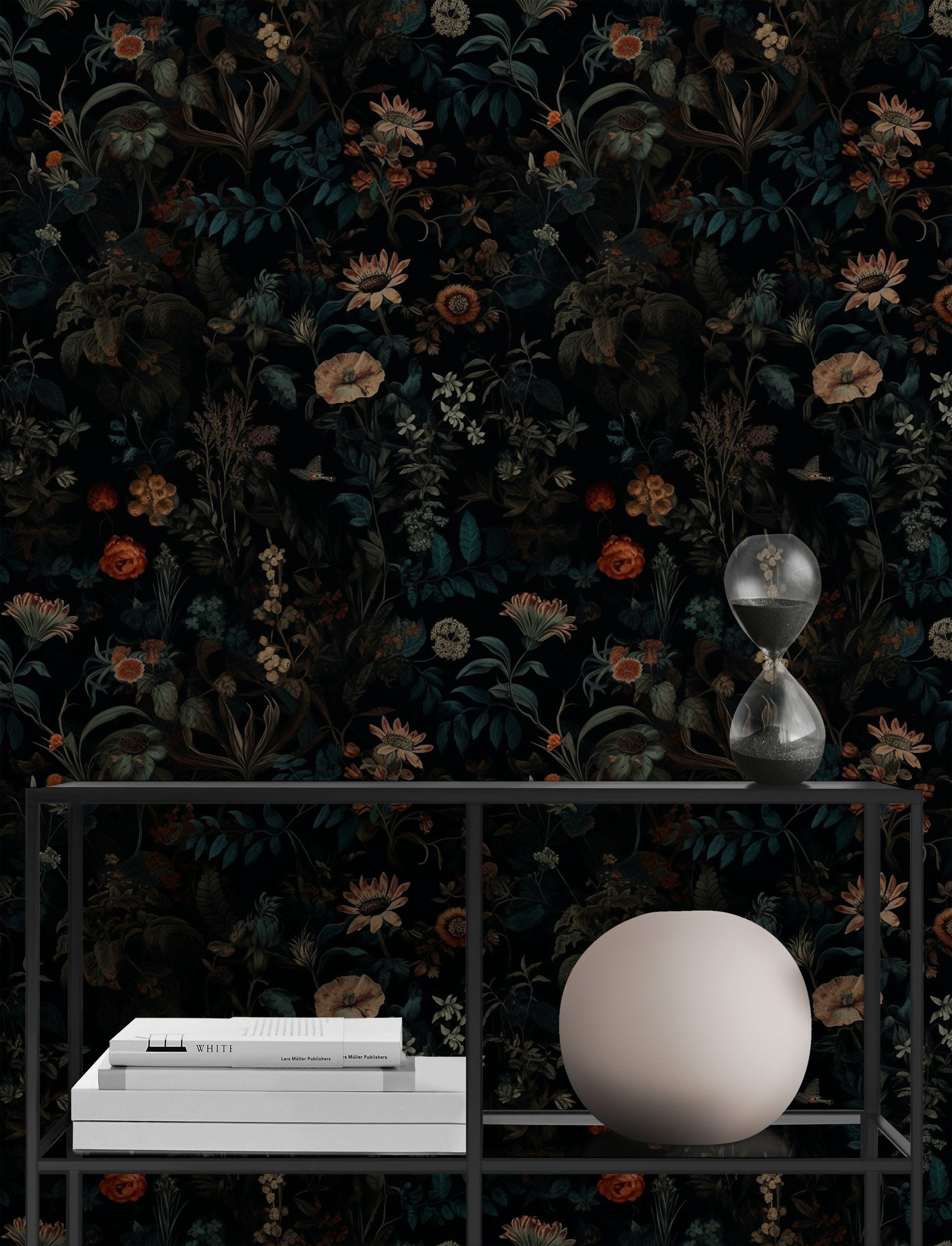 Elevate your home decor with this elegant botanical floral wallpaper, featuring a deep, dark background that provides a striking contrast to the vibrant botanical elements. This lush and intricate pattern showcases a variety of flowers, leaves, and natural elements, creating a sense of depth and opulence.