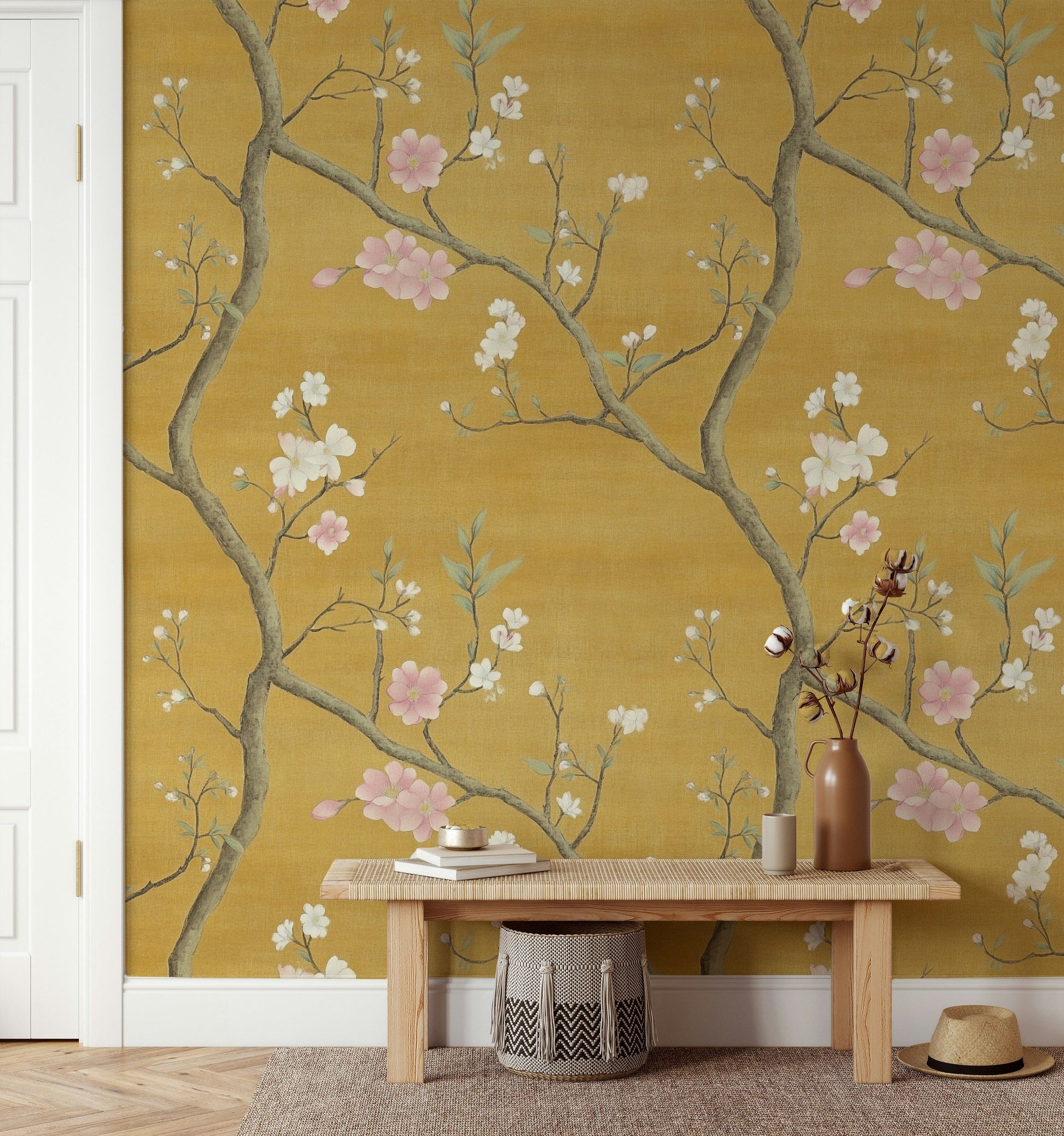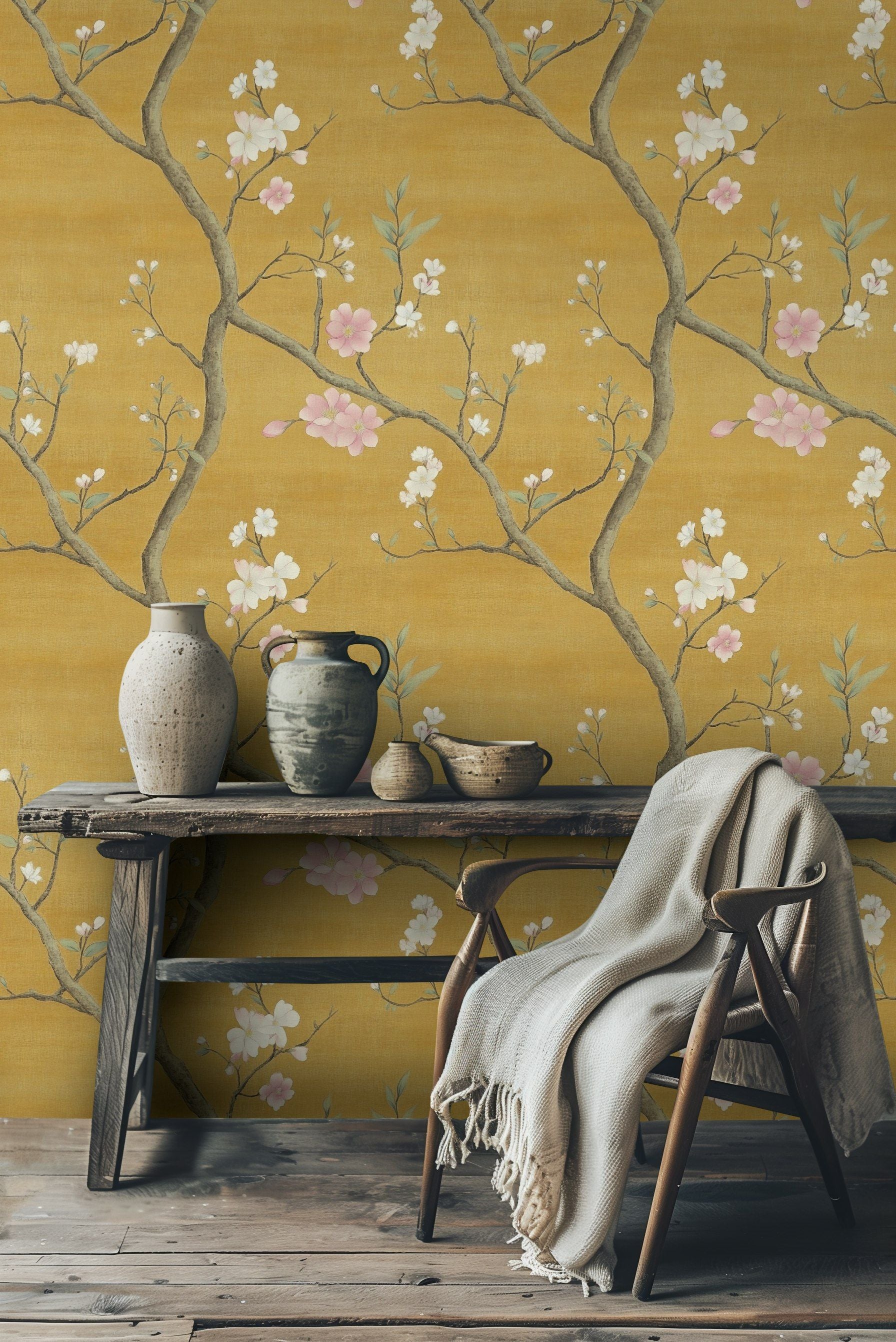Bring an elegant touch to your home with our "Elegant Chinoiserie Floral Wallpaper." This peel and stick mural features a delicate scene with slender branches adorned with soft pink blossoms set against a warm yellow background. Perfect for living rooms, bedrooms, or any space that could benefit from a sophisticated update. The intricate floral design and rich colors add a timeless charm, making it an ideal choice for those who appreciate classic decor with a modern twist. Easy to apply and remove, this wallpaper offers a hassle-free way to enhance your interior design.