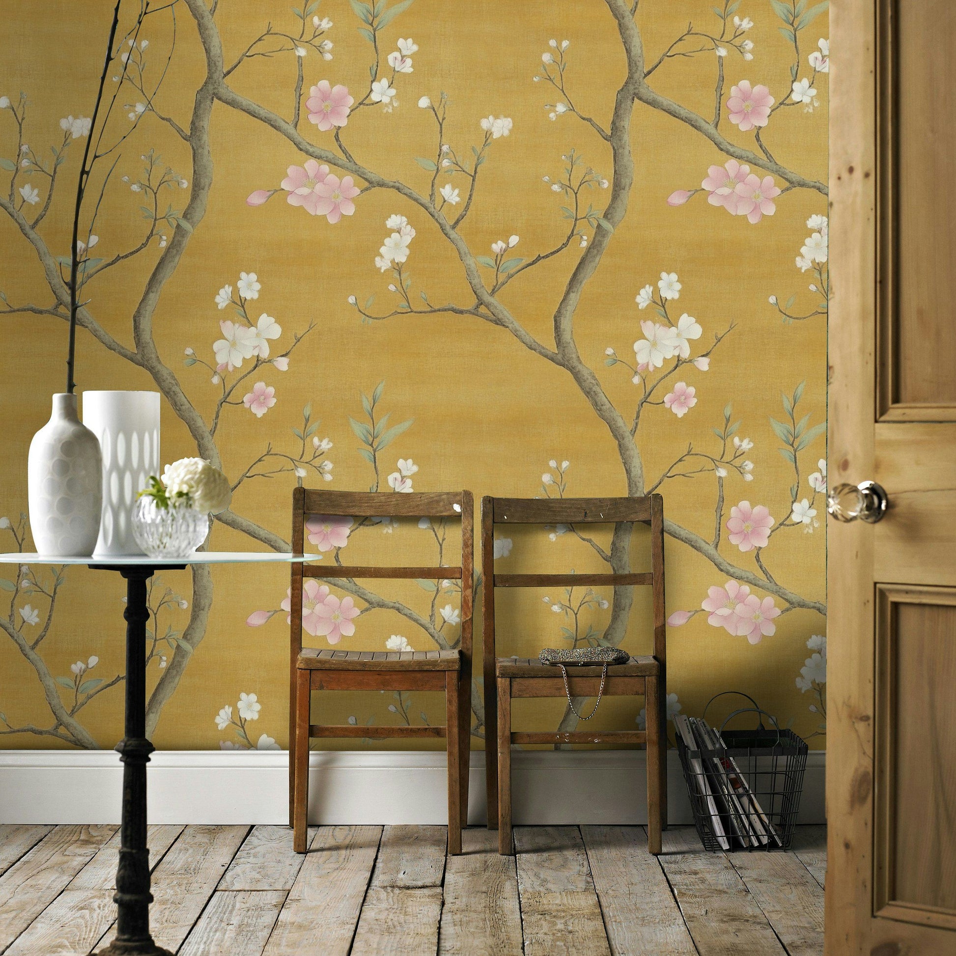 Chinoiserie Floral Wallpaper Yellow Background Wall Decor