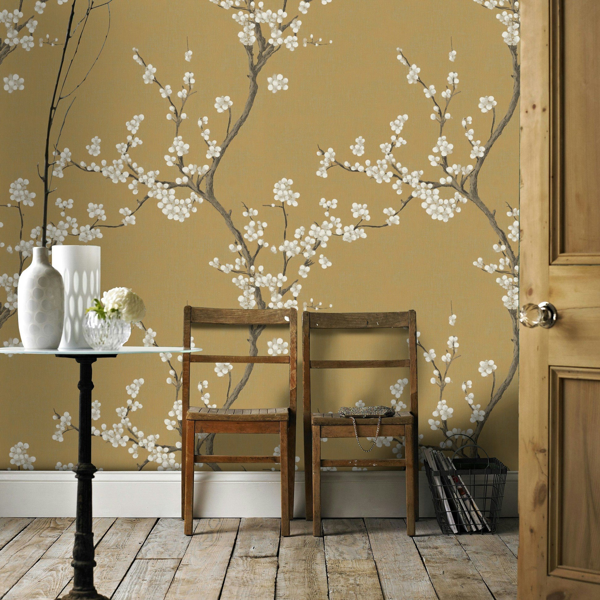 Elegant Chinoiserie-Inspired Wallpaper Branches on Mustard