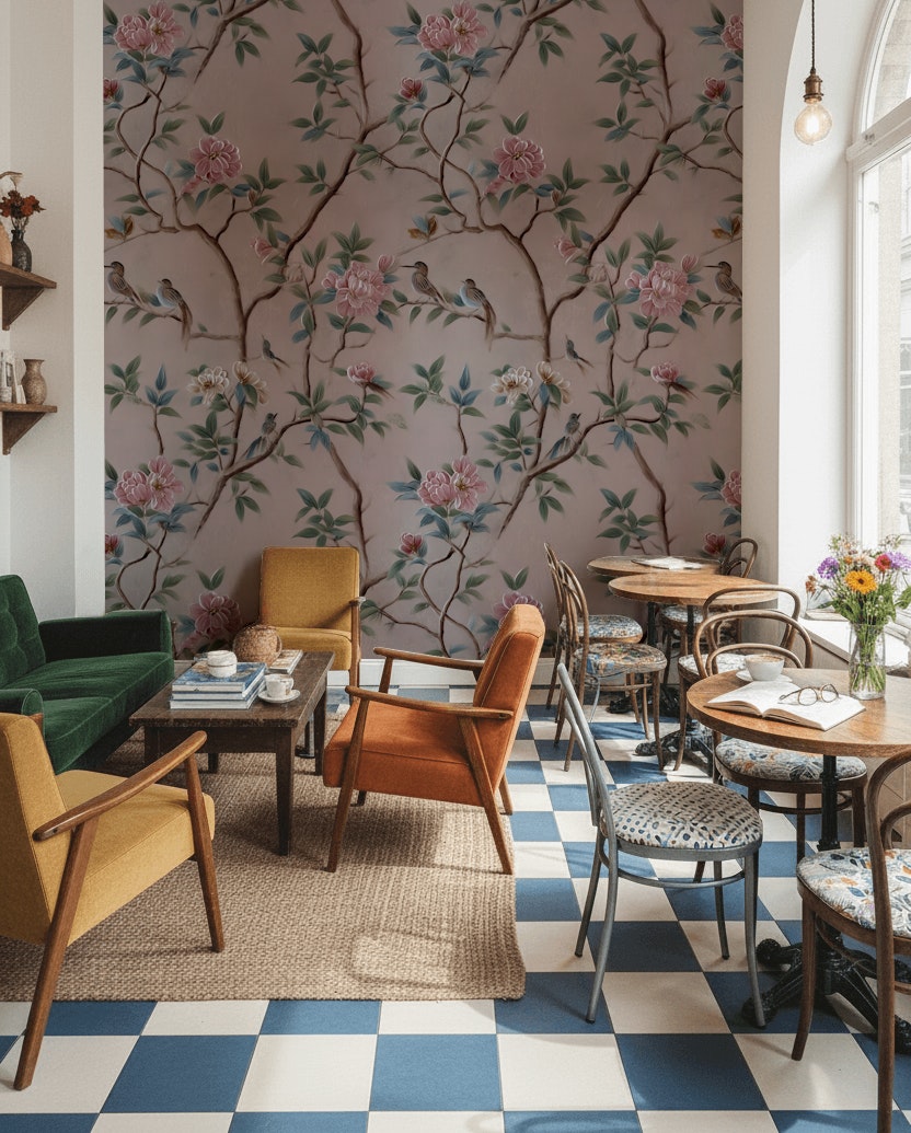 This elegant wallpaper includes delicate birds and floral patterns, capturing a traditional Chinoiserie style. The design showcases pink and green tones with intricate branches, ideal for vintage decor.