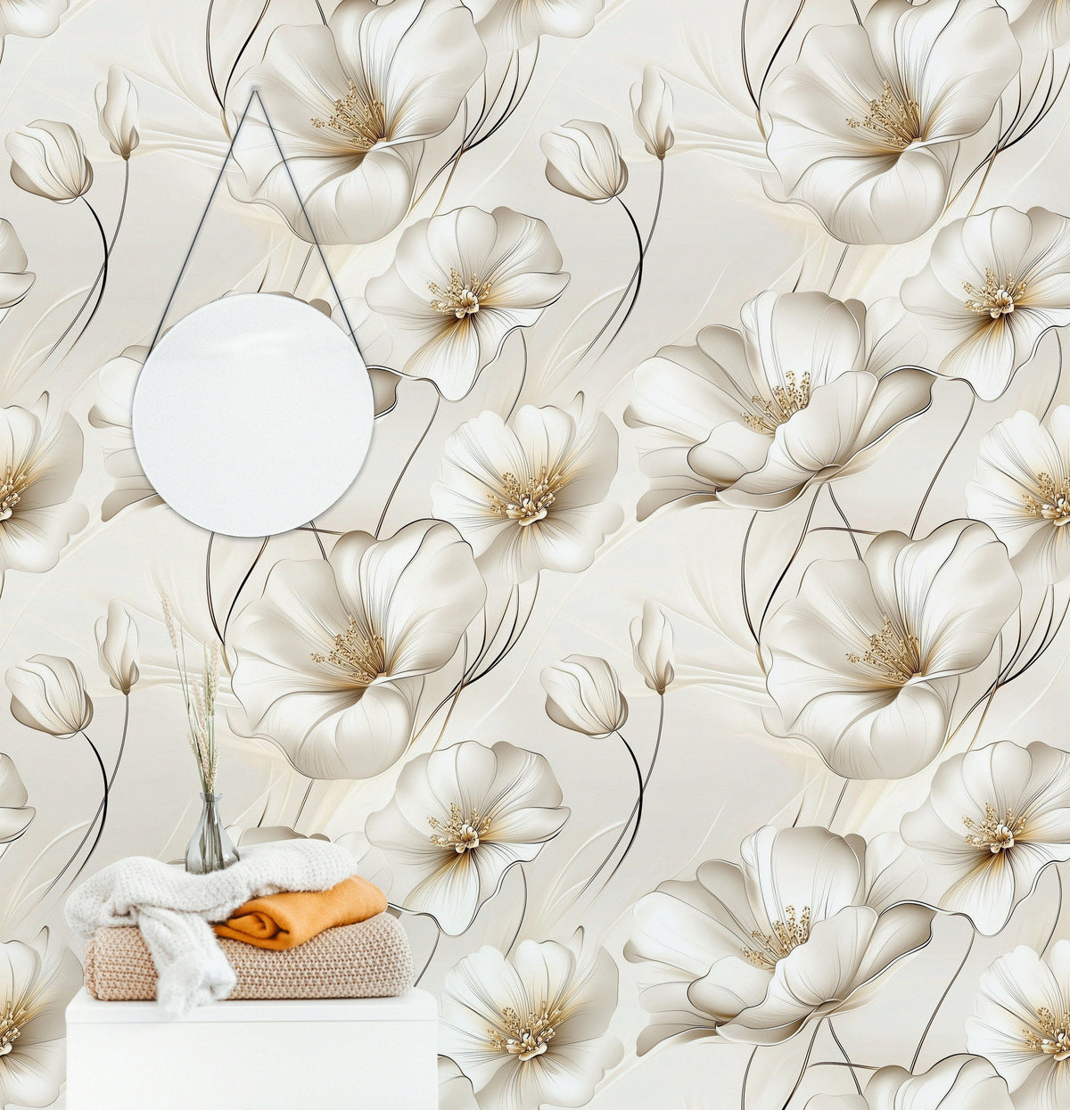 The large floral pattern of the Elegant Cream Large Floral Blossom Wallpaper adds a contemporary touch to modern interiors. The dimensional effect of the petals enhances depth, making it a standout feature that complements luxury and modern decor styles, especially when paired with light wood and gold accents.