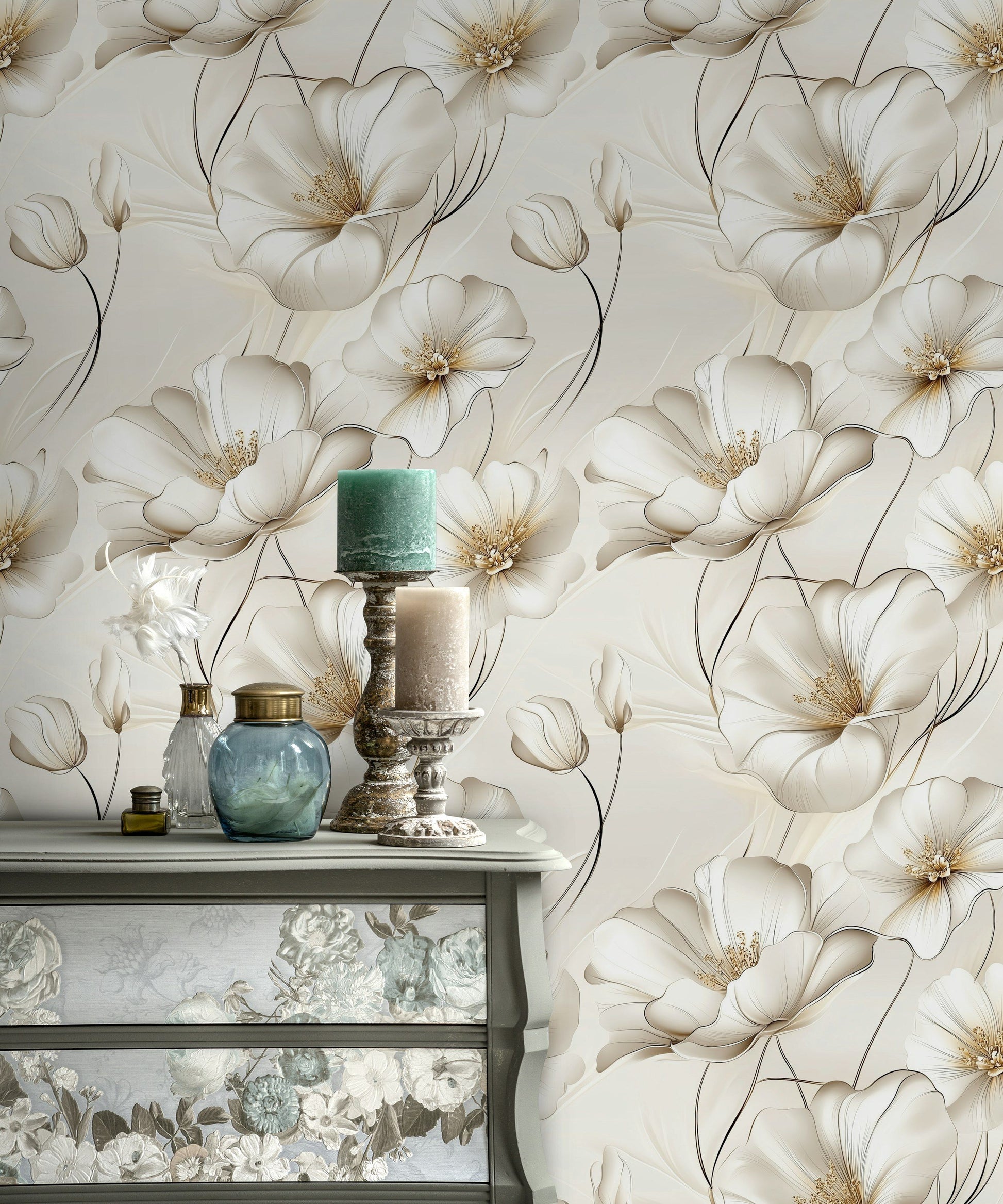 Transform your space with this elegant ivory floral wallpaper, featuring soft, delicate flowers that bring a sense of serenity and luxury to any room. The subtle botanical design in a neutral palette is perfect for creating a calm and sophisticated atmosphere in living rooms, bedrooms, or even nurseries. This peel and stick wall mural offers an easy and hassle-free installation, making it ideal for both renters and homeowners. Whether you're looking to enhance a feature wall or cover an entire room, this luxurious flower pattern is sure to elevate your decor with its timeless beauty.