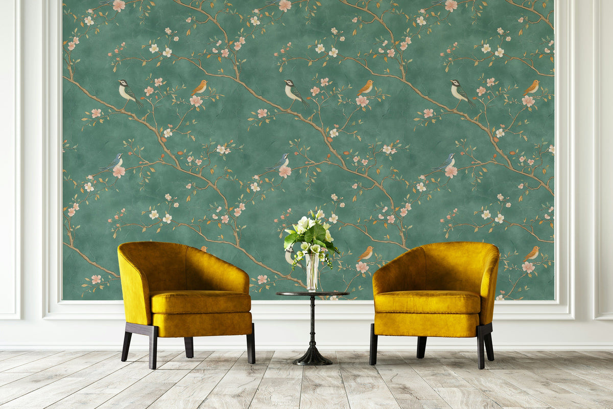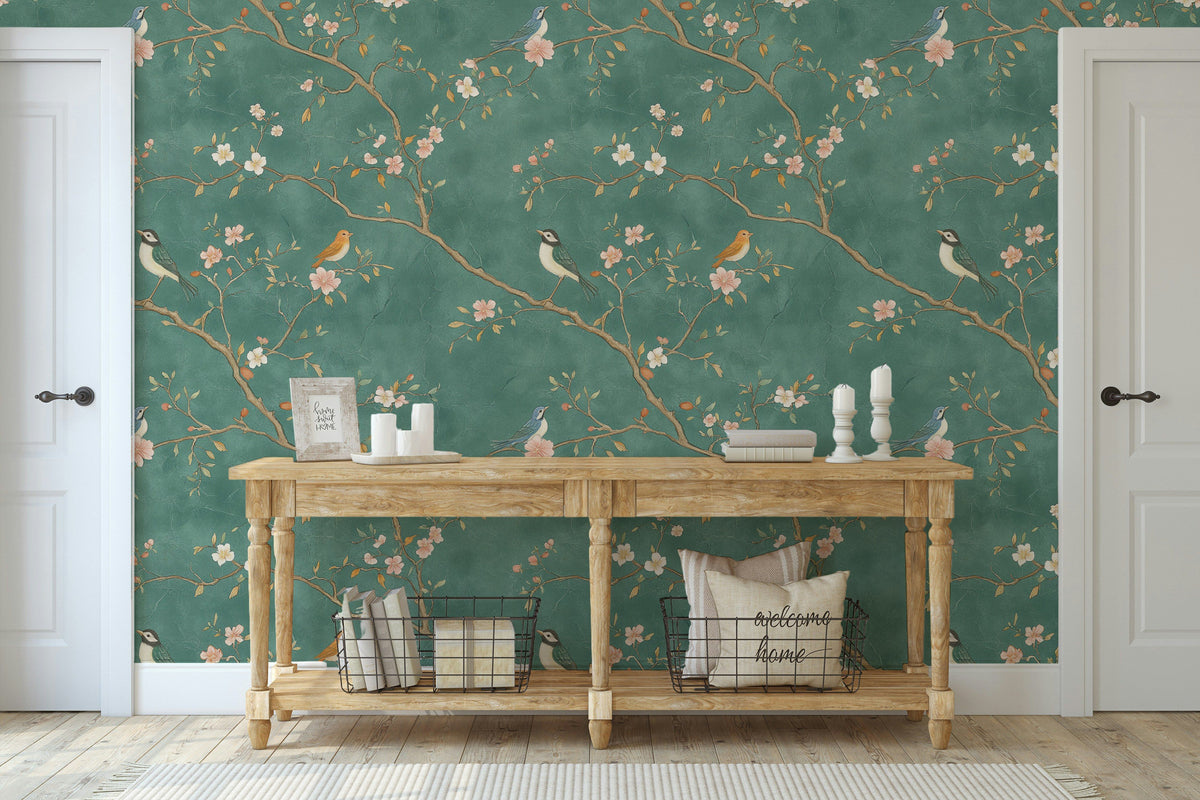 Emerald green wallpaper features delicate cherry blossoms intertwined with graceful birds, adding a touch of nature to your space. The medium-scale pattern and subtle texture offer a serene visual appeal.