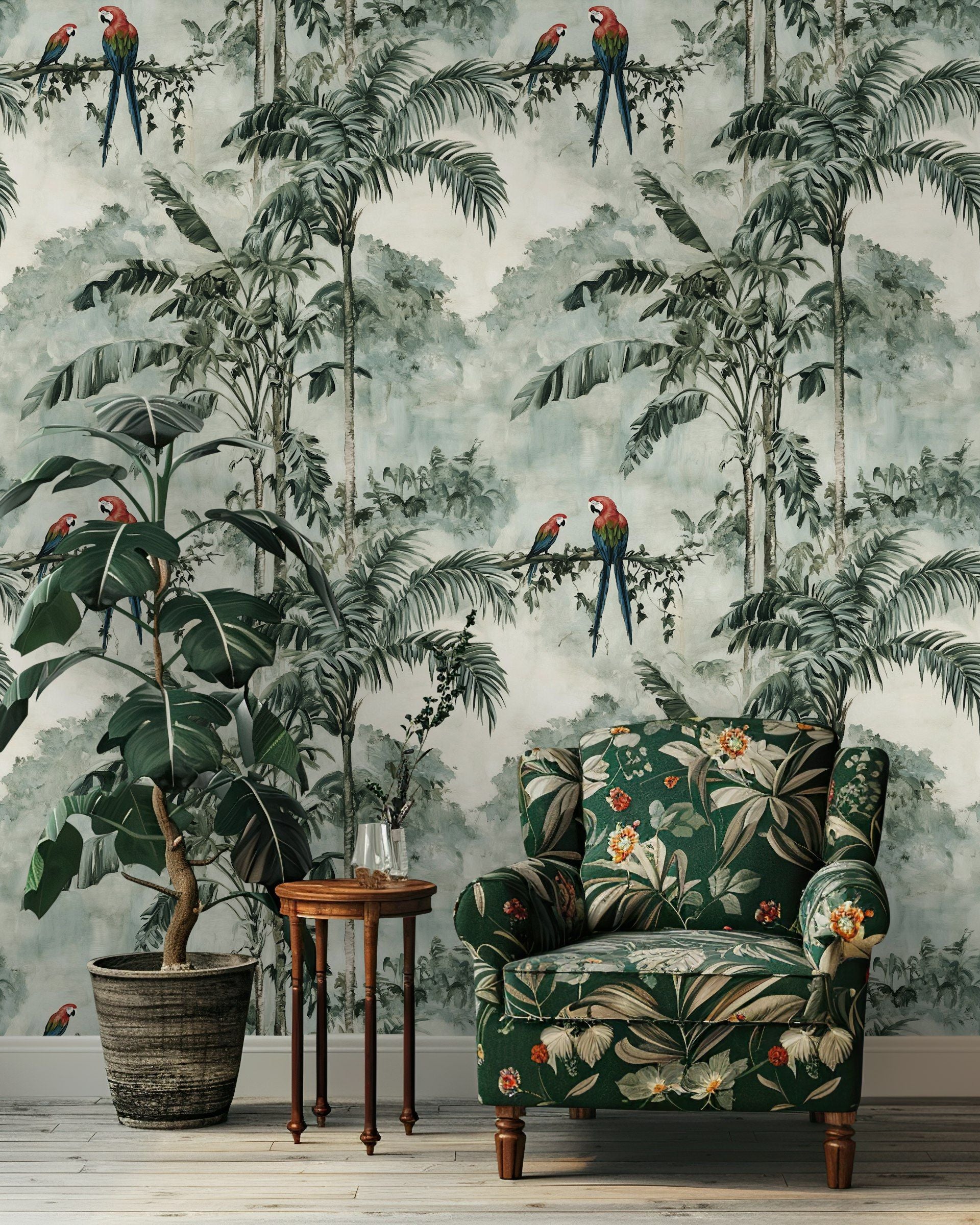 Transform your living space with the "Exotic Green Jungle Parrots Wallpaper." This peel and stick tropical mural features a detailed jungle scene with vibrant green foliage, tall palm trees, and stunning red parrots perched on branches. Ideal for bringing a touch of exotic beauty and tranquility to your living room, bedroom, or any room in need of a refreshing update. The easy-to-apply and remove design allows you to revamp your home decor effortlessly. The lush green background and colorful parrots create a lively and inviting atmosphere, perfect for those who love nature and tropical vibes.