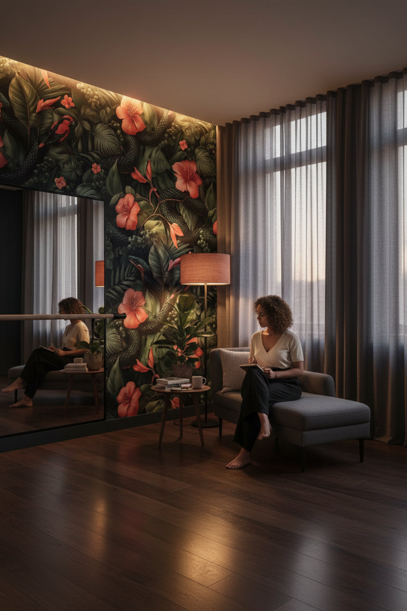 The Dark Black Jungle Floral and Bird Wallpaper complements bohemian style decor with its vibrant tropical flowers and exotic bird motifs. The bold colors and large-scale patterns enhance the eclectic and artistic vibe that is characteristic of bohemian interiors.