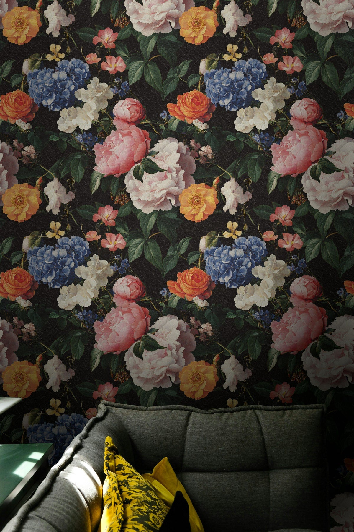The contrast of bright florals on a dark backdrop creates a sophisticated and vintage atmosphere, enhancing the room with a touch of elegance.