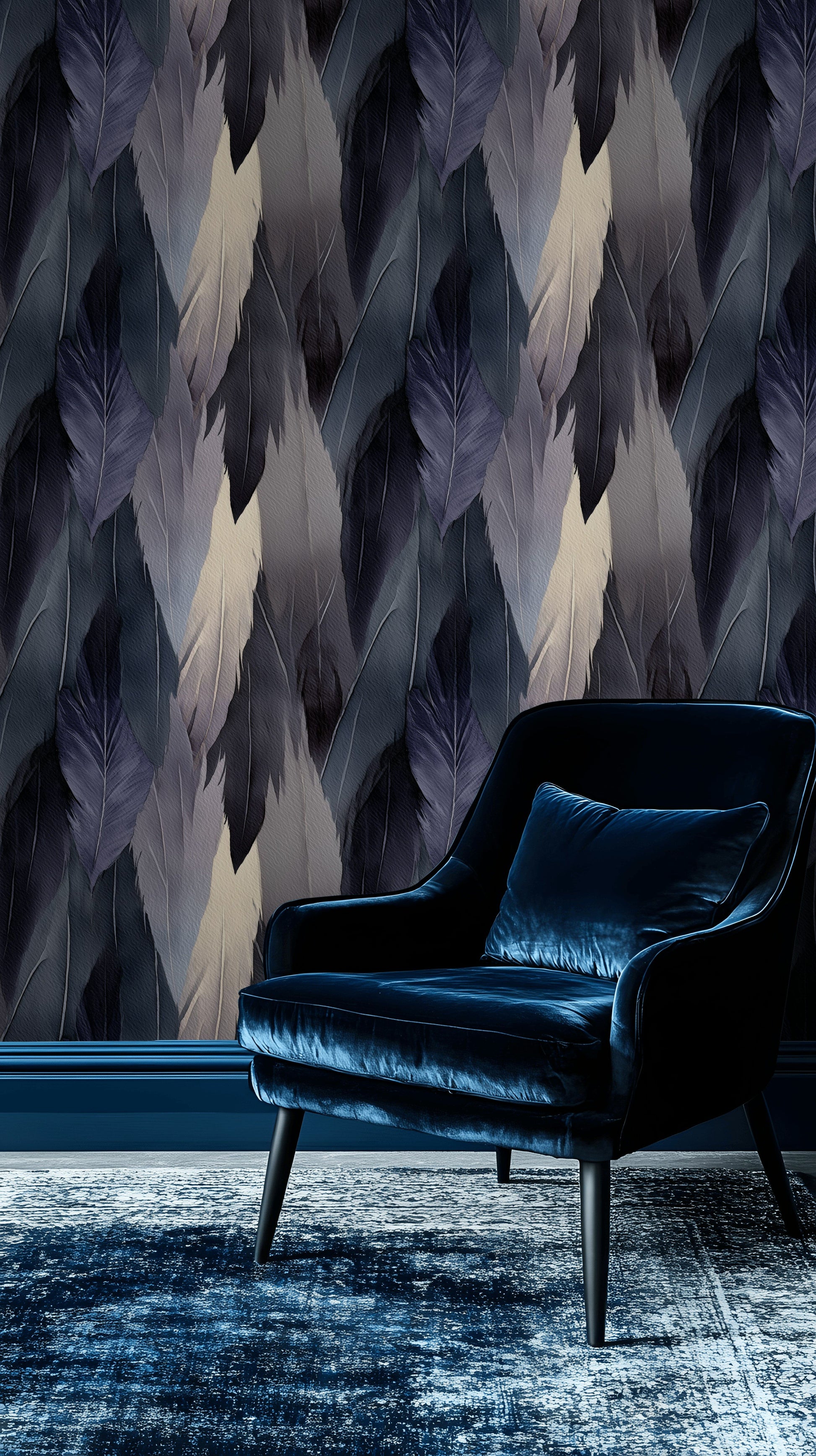 This feather wallpaper features indigo mural details and a watercolor decor pattern of layered blue and navy feathers. Printed as a peel and stick mural, it’s a removable option for creating a modern wall accent or calm decor statement. The artistic wall design adds a soft pattern to bedrooms or reading nooks, with abstract feathers and gentle grays woven throughout the textured mural.