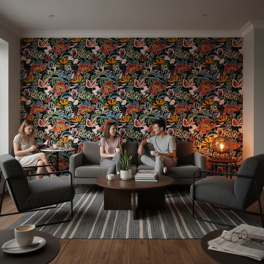 The Vibrant Multicolor Large Floral Dark Wallpaper complements bohemian style decor through its vivid hues and painterly texture. Its eclectic blend of colors and artistic feel enhances the free-spirited and eclectic vibe typical of bohemian interiors.