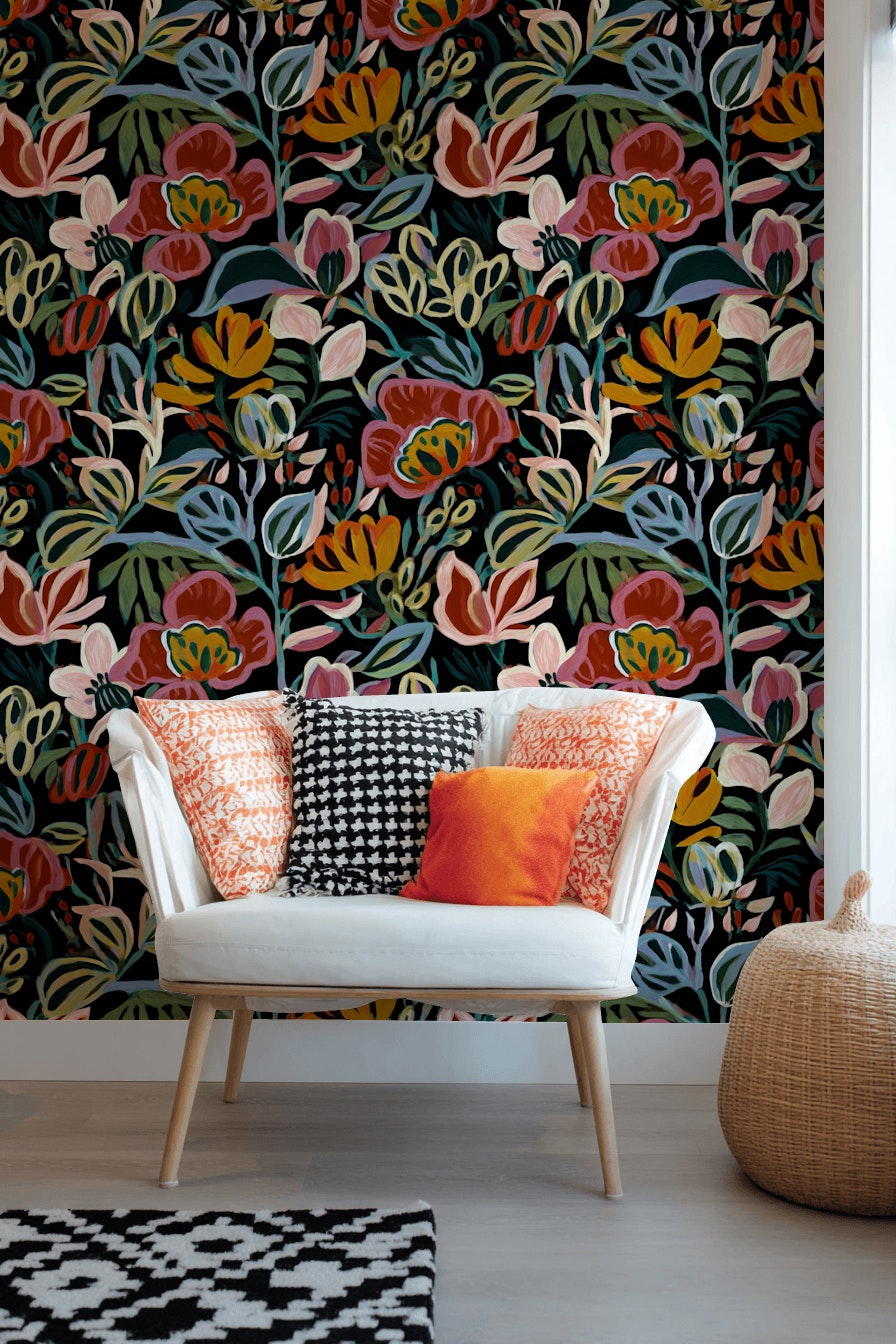 Bold and dynamic, this wallpaper showcases oversized multicolor floral patterns on a deep black background. The vivid hues and painterly texture create a striking artwork-like feel, offering a modern twist to traditional floral motifs.Perfect for living or dining room feature walls where contemporary meets artful expression. The rich backdrop allows the colors to pop, bringing a lively energizing element into the space.The dark tone absorbs light to create a dramatic ambiance. Paired with warm l