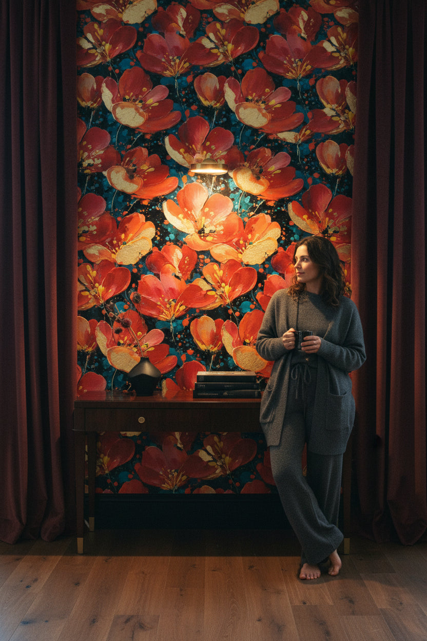 The low-light finish of the Vibrant Crimson Floral on Deep Black Wallpaper creates a moody and elegant ambiance. This finish enhances evening settings, adding a touch of sophistication and warmth to living rooms or bedrooms.