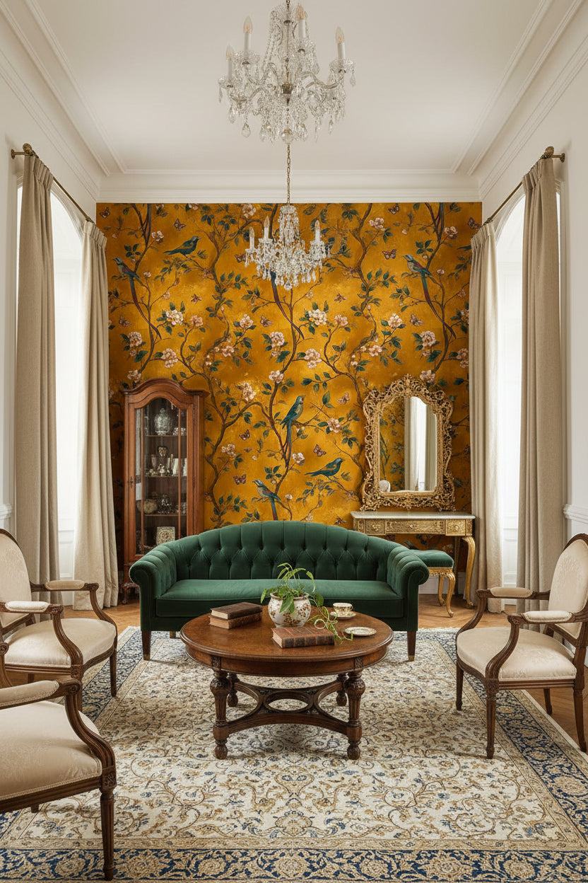 This elegant chinoiserie wallpaper features an intricate design of birds, flowers, and butterflies on tree branches. The rich blend of orange, blue, and green hues combined with its traditional style makes it suitable for vintage decor.