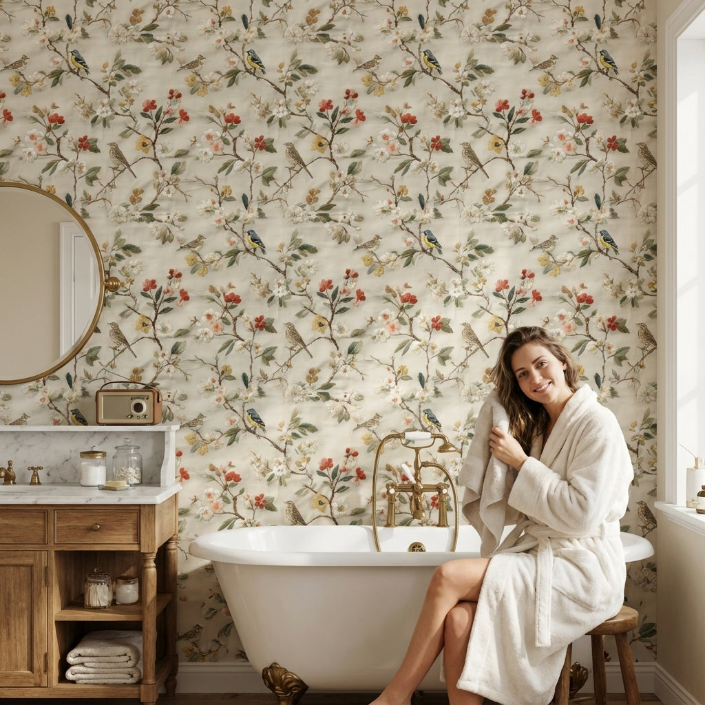 This wallpaper stands out with its delicate vintage floral patterns and colorful birds, offering a sophisticated yet playful aesthetic. The combination of light cream tones and medium-scale designs adds a unique blend of elegance and warmth, making it distinct from other floral options.