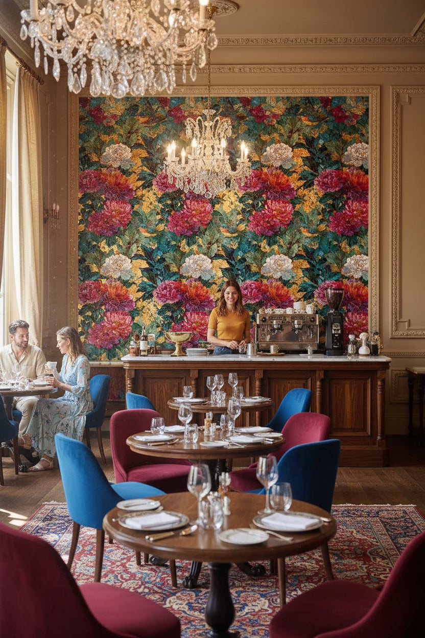The combination of deep fuchsia peonies, a rich gold background, and detailed bird motifs in the Rich Gold and Emerald Floral Bird Wallpaper creates a stunning focal point in any dining room. Its luxurious texture and dark tone add a touch of sophistication and elegance, perfect for entertaining spaces.