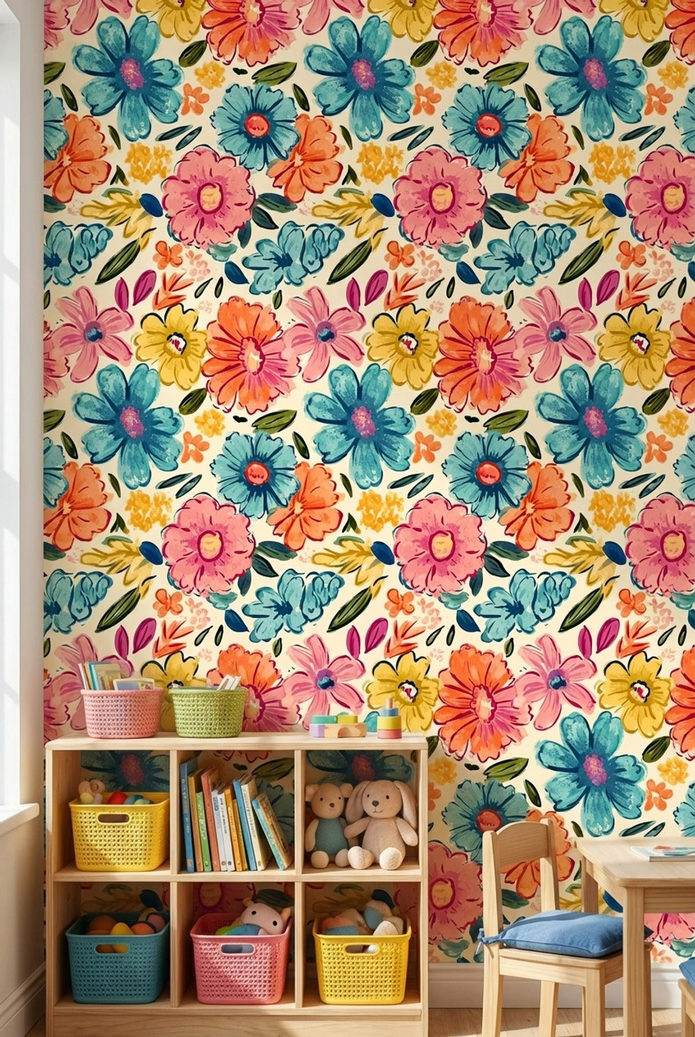 The Vibrant Multicolor Floral Pattern Wallpaper is made from high-quality materials, ensuring it is safe and durable for children's spaces. Its non-toxic inks and smooth finish make it a child-friendly option for decorating.