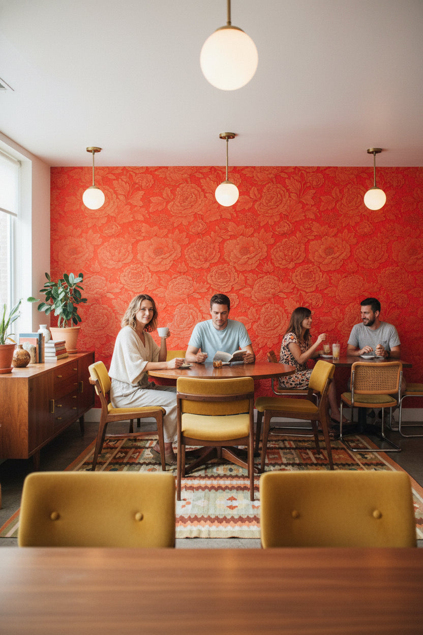 What type of furniture pairs well with the Rich Scarlet Large Floral Embossed Wallpaper?