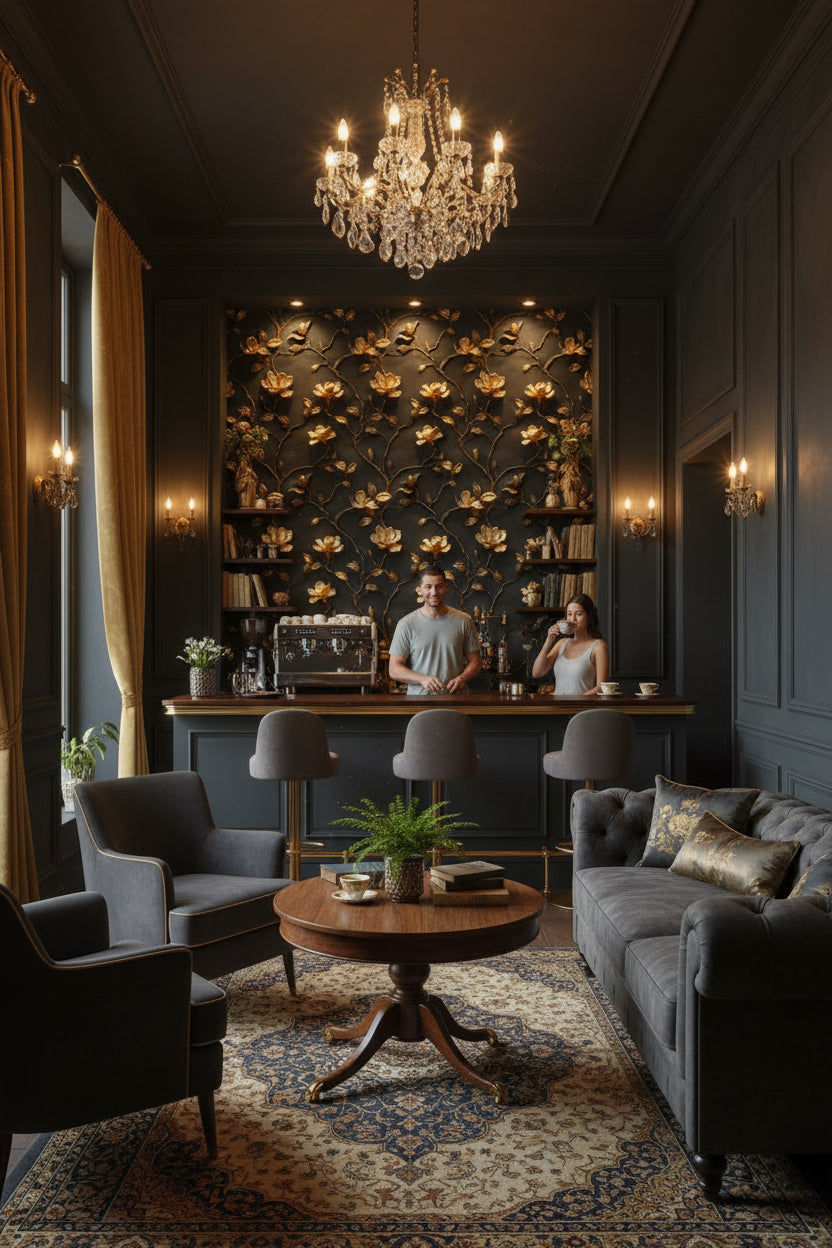 The large-scale floral pattern of magnolia blooms on a dark background brings a sense of opulence and sophistication. The metallic gold accents subtly reflect light, making it a perfect choice for luxury-themed interiors.