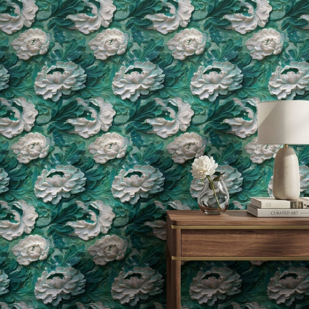 Large white florals appear meticulously detailed against a vibrant teal background, giving this wallpaper a luxurious garden feel. The bold floral motifs create a striking visual impact, perfect for modern living spaces.Ideal for feature walls in living rooms and master bedrooms, the teal and white contrast brings a fresh yet elegant touch to interiors.The detailed texture adds depth and sophistication, enhancing natural light and creating a bright, open atmosphere.Complements modern luxury déco