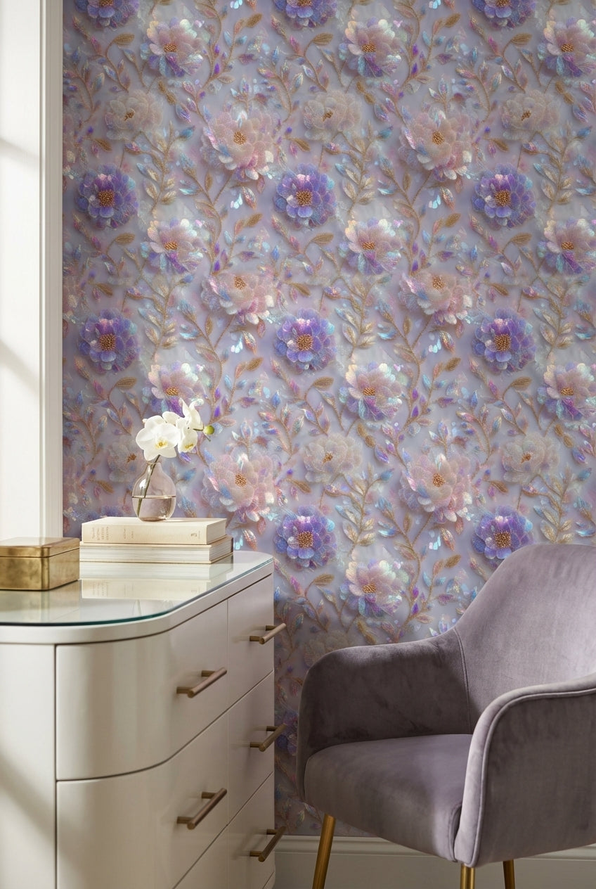 This elegant wallpaper shows a luxurious floral design with shimmering gold and purple accents. The modern style and iridescent colors create a sophisticated atmosphere, featuring delicate flowers and leaves in hues of blue, pink, and white.