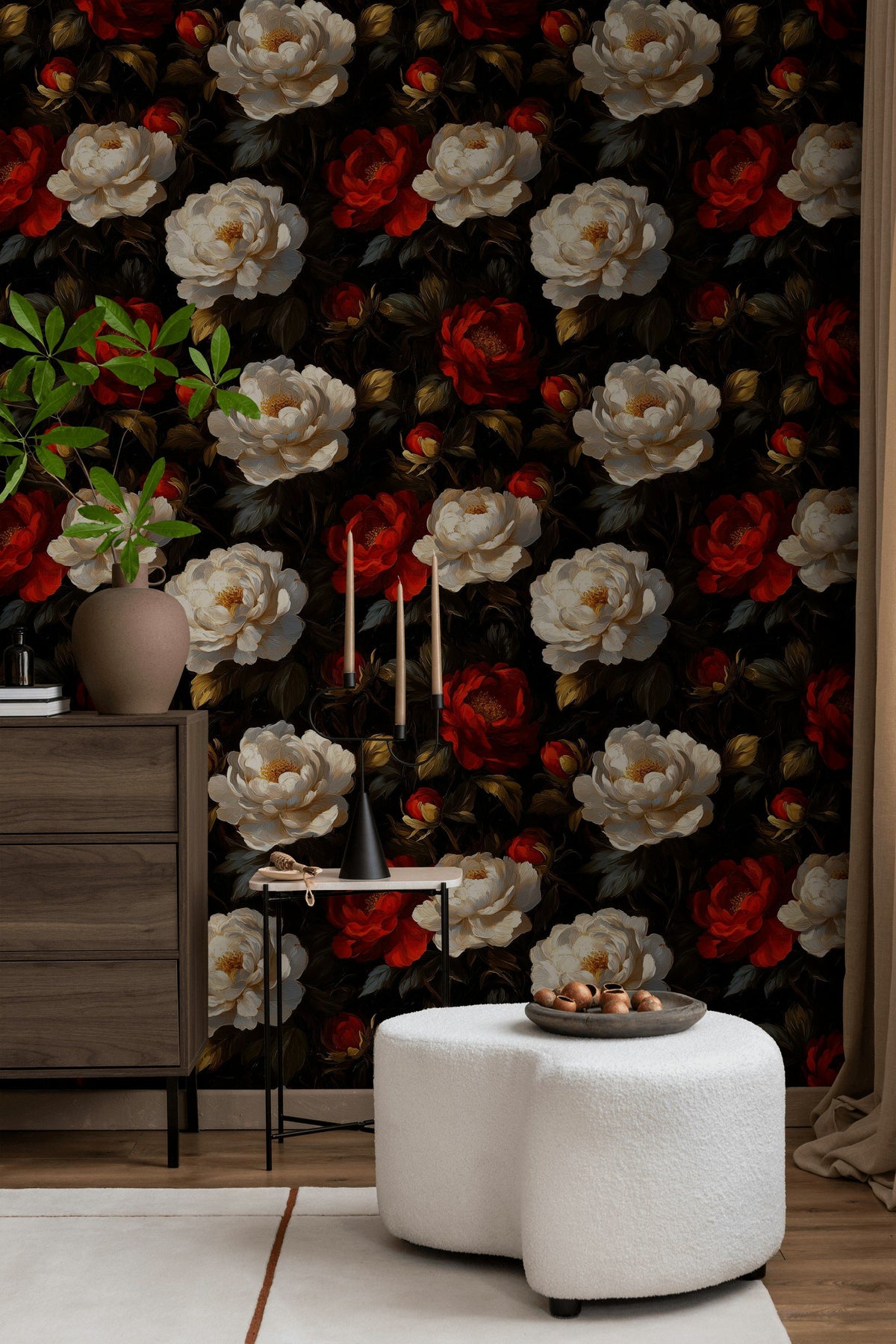 Rich red and ivory roses bloom majestically against a deep black background, lending a classic yet dramatic touch to your walls. This wallpaper features a bold, traditional floral pattern with smooth, luxurious textures that make each bloom stand out vividly. Perfect for creating an elegant focal point in any room, the dark tones highlight the intricate details of the rose petals and lush foliage.Designed to enrich living rooms or bedrooms with an atmosphere of vintage elegance and floral opulen