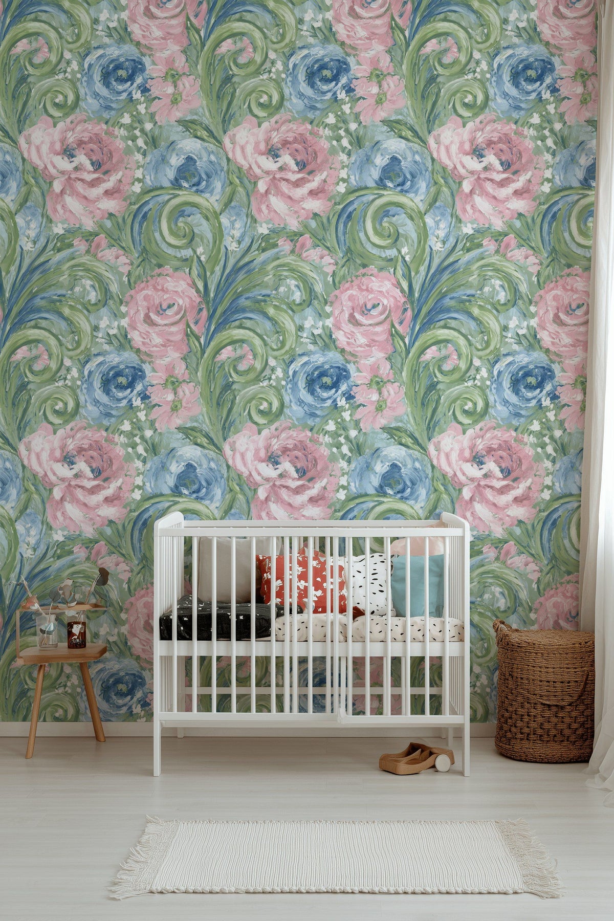 A vibrant floral wallpaper featuring large pink and blue blossoms swirling within lush green foliage. The brushstroke texture gives a painterly feel, creating a whimsical garden scene perfect for nursery or kids' room walls. This design brings a lively and joyful mood, making spaces feel playful and inviting. Ideal for modern interiors, it pairs well with wooden furniture and soft textiles. A charming addition to any child's space.