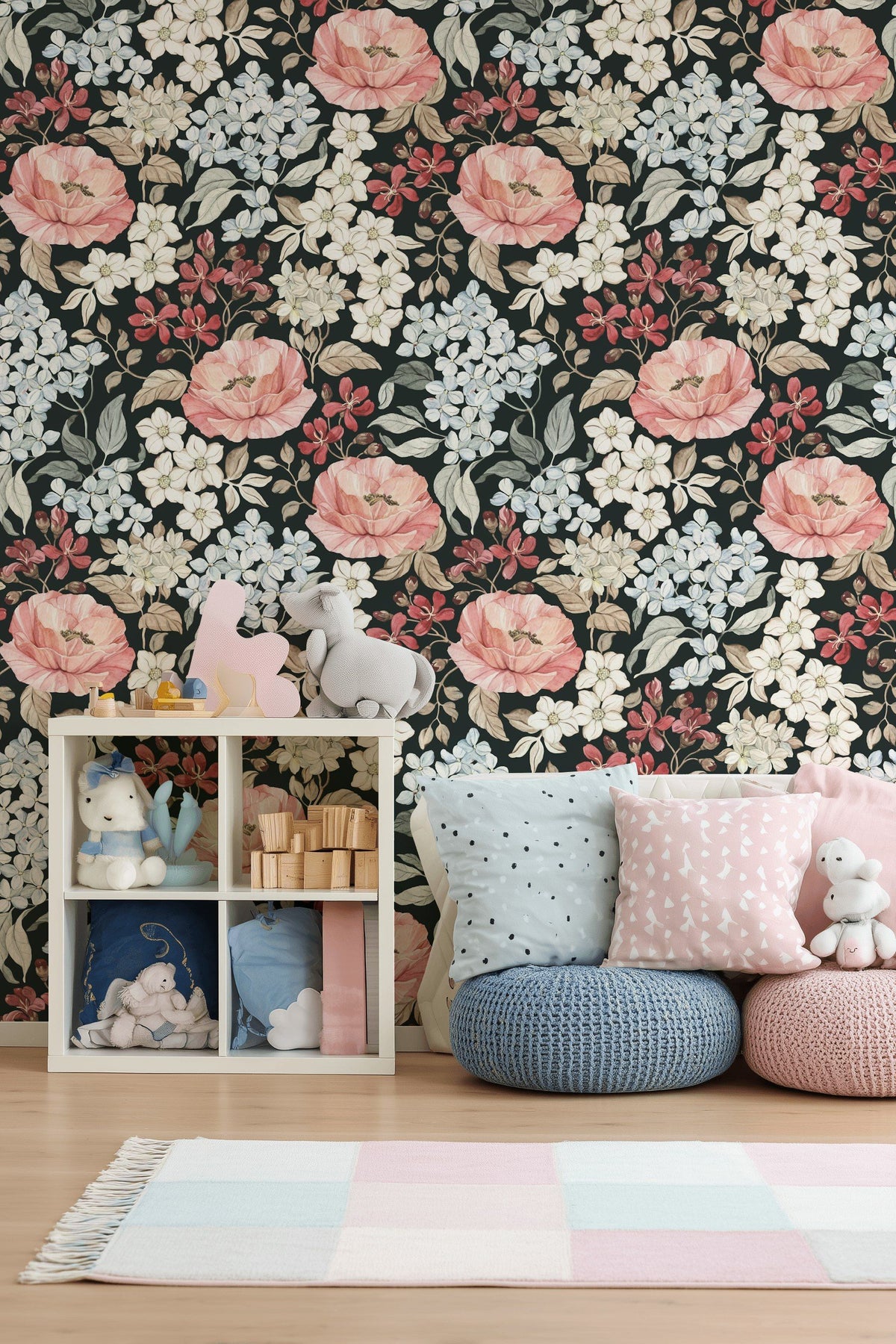 Lush floral patterns featuring large blooming roses and delicate foliage unfold against a dramatic black background. The contrast of soft pink blooms with subtle cream and white flowers brings a romantic elegance to the design. Perfect for nursery accent walls or bedroom feature spaces, this wallpaper creates a cozy, intimate atmosphere that enriches the room’s depth. The matte finish ensures low light reflection, enhancing the warmth and elegance. Matches beautifully with modern and classic int