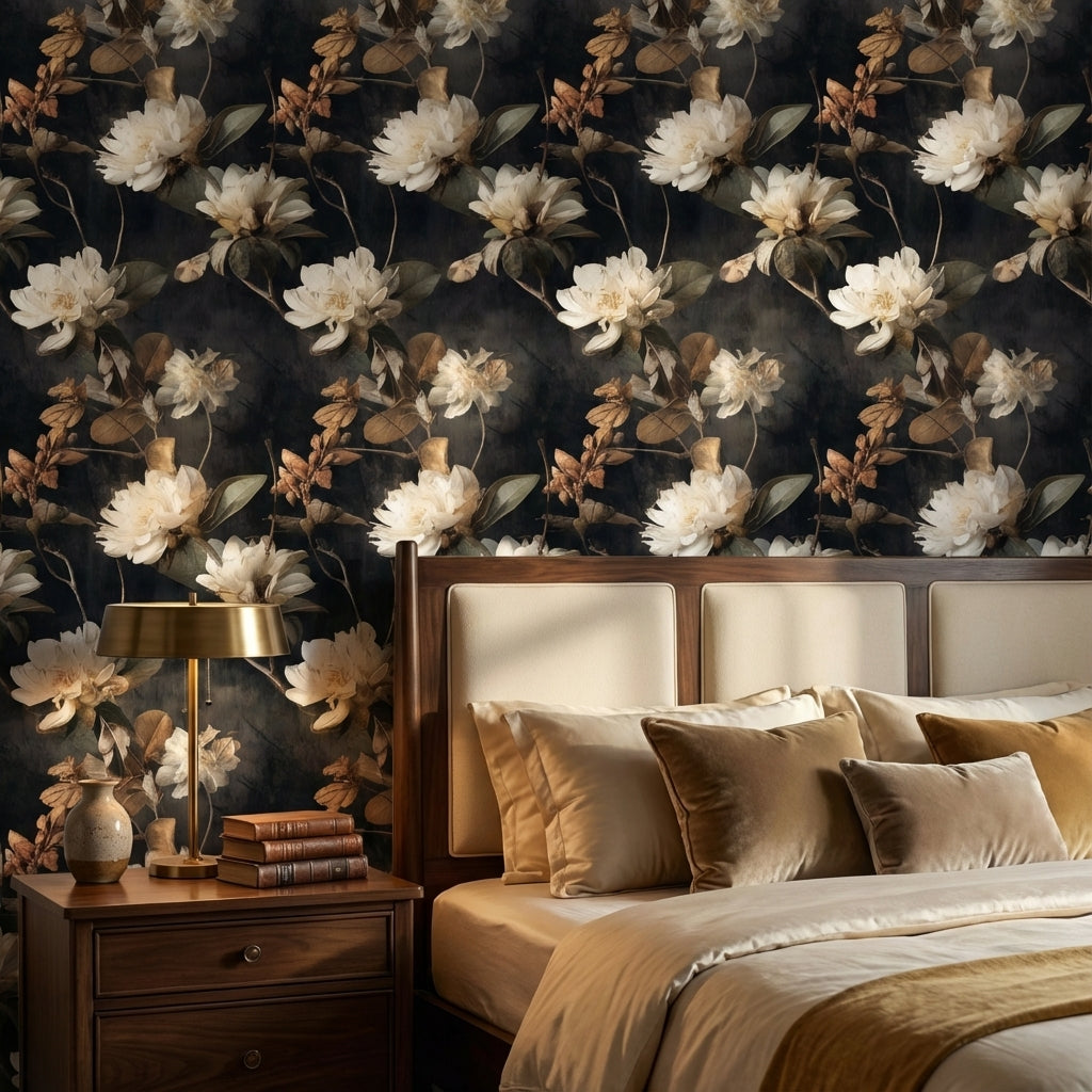 On a rich black background, large ivory blooms unfurl with a painterly elegance, capturing the essence of timeless sophistication. The lush florals are meticulously detailed, offering a striking contrast that highlights their delicate petals and leaves.This design is perfect for creating a focal wall in a luxurious living room or serene bedroom, where its dramatic appeal adds depth without overpowering the space.The low-light tones of the wallpaper absorb ambient light, contributing to a warm an