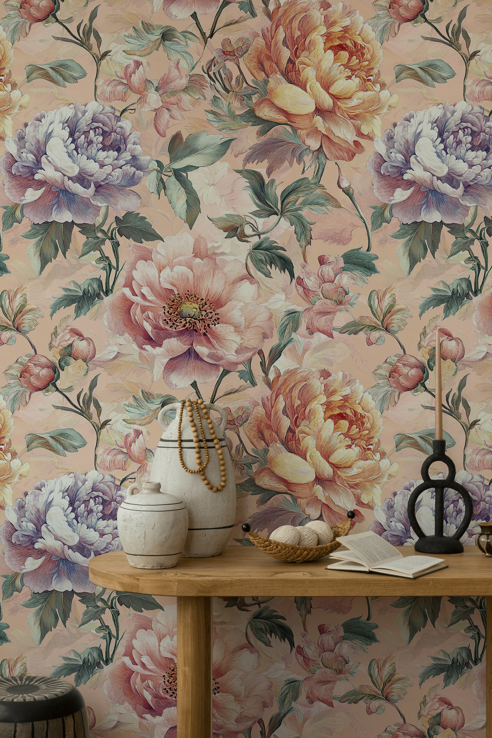 This floral wallpaper is designed with oversized peony blooms in peach blossoms, lilac flowers, and soft blush decor shades. Printed with watercolor floral detail and fine botanical linework, it creates a garden wall feel with pastel wall tones. The peony wallpaper brings together oversized flowers and romantic wallpaper style, making it a versatile choice for both adult and teen rooms. The blend of floral mural and soft pastel hues offers a graceful botanical blooms design suited for all ages.