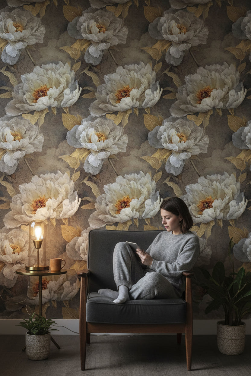 Large peony blooms in warm gray and gold tones adorn a textured background, creating a rich, luxurious floral wallpaper. The oversized flowers bring a touch of elegance and are beautifully rendered to capture every detail.Ideal for living room feature walls or bedrooms that crave a statement piece. The combination of warm gray and metallic gold adds depth and sophistication, making it a great choice for contemporary and luxury interiors.The intricate detail and soft gradient reflections enhance