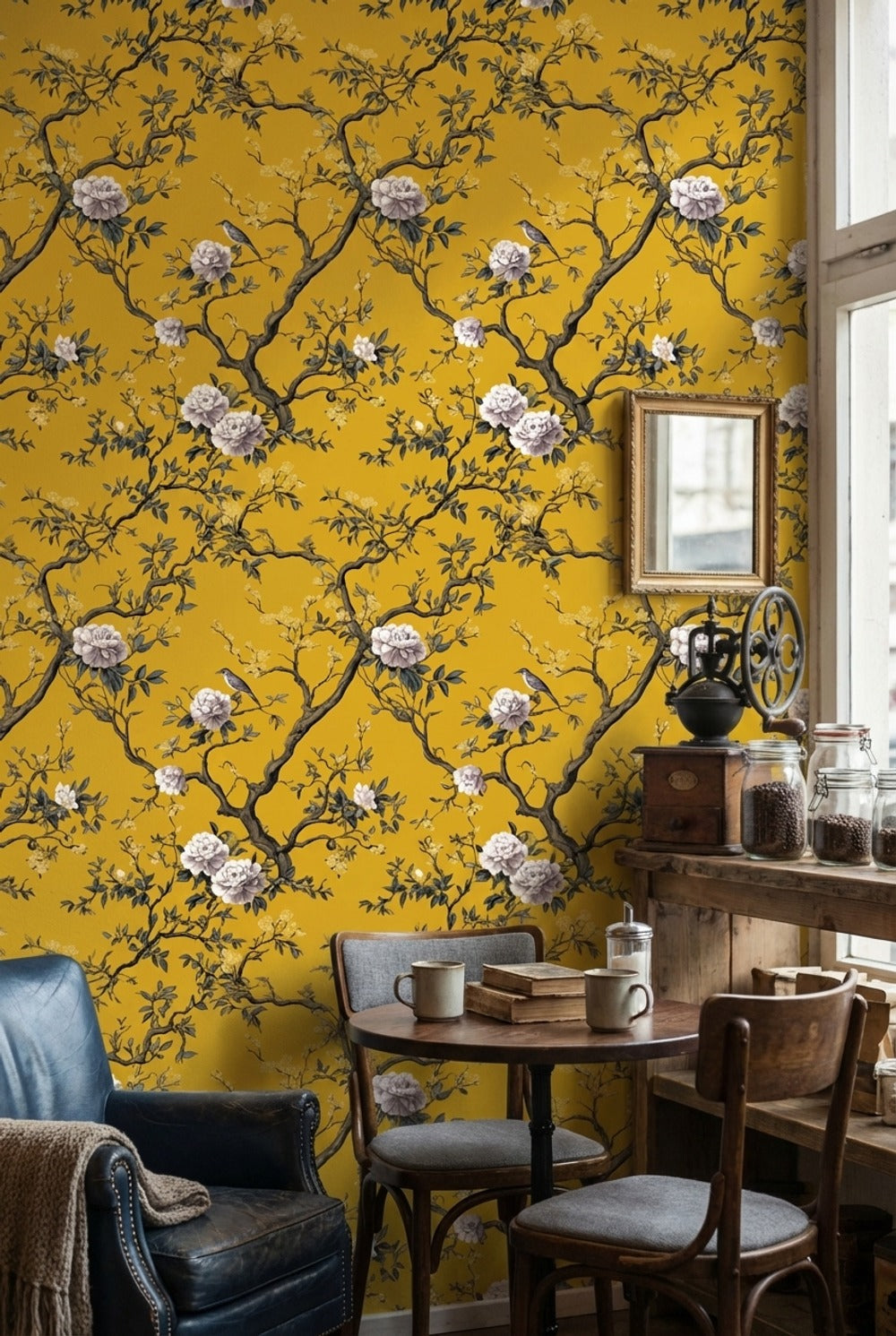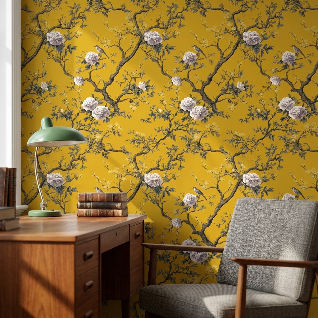 Vibrant golden yellow wallpaper featuring elegant chinoiserie floral and bird motifs, with delicate roses and branches. The rich background enhances the intricate design, creating a captivating contrast.