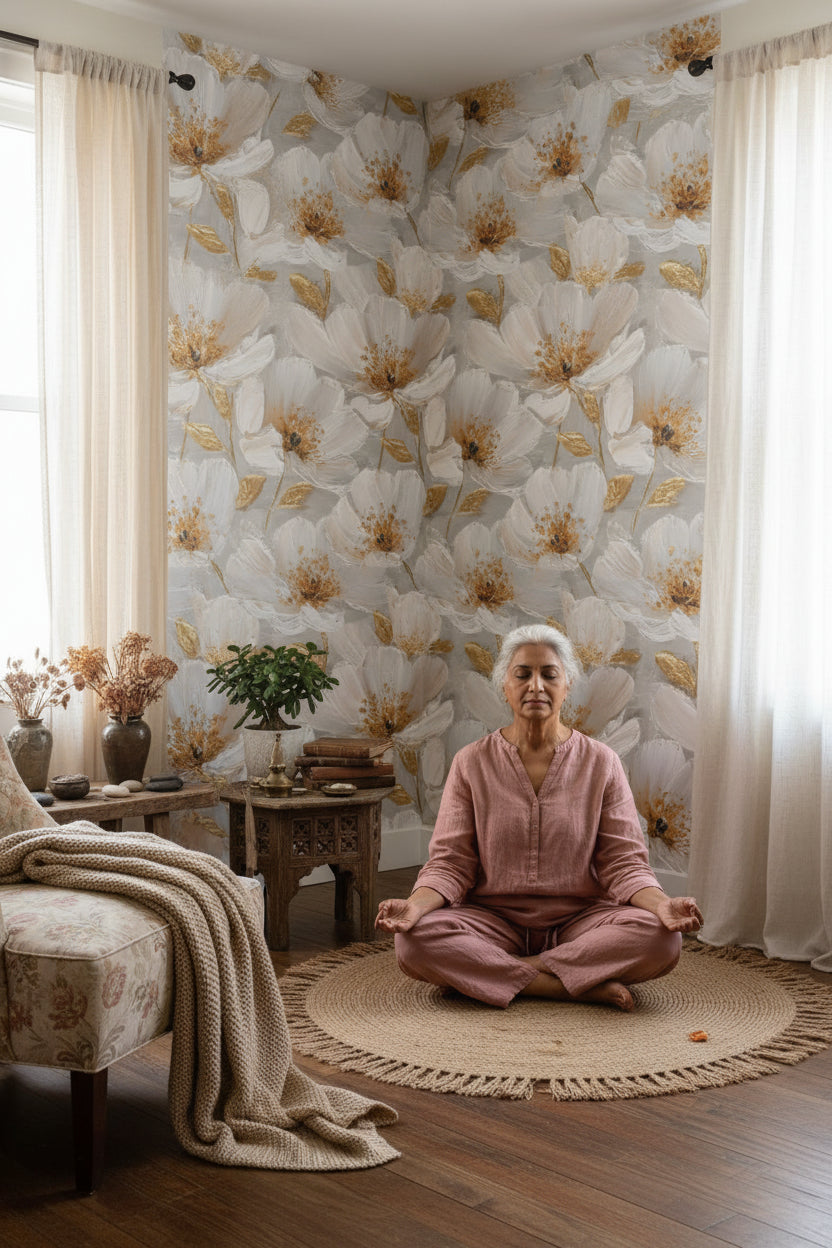 Floral Wallpaper White Flowers Gold Accents Removable Wall Decor