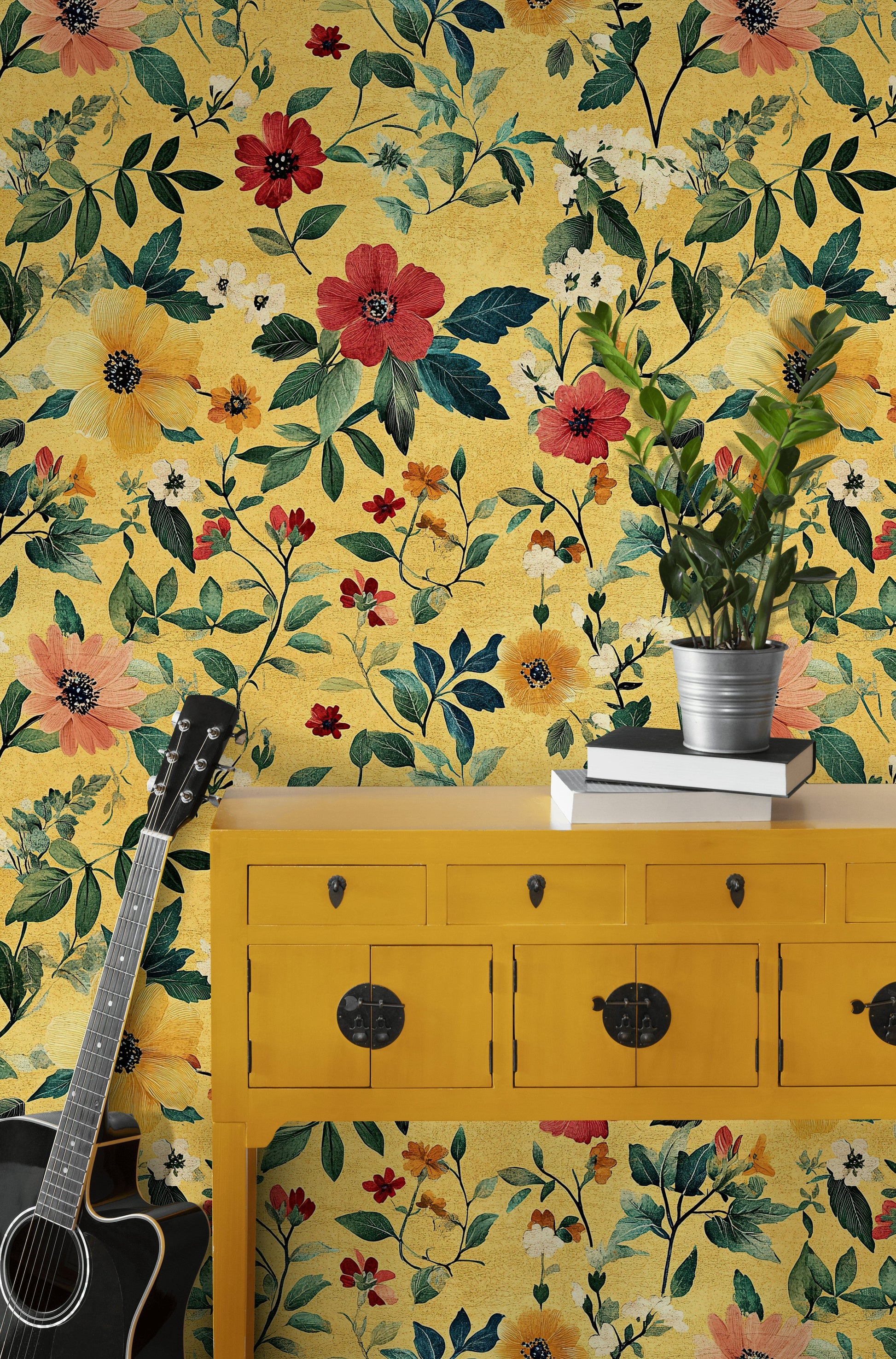 This wallpaper features a botanical design printed with vivid floral artwork in shades of yellow, red, and orange against a golden background. The pattern includes large blossoms, green leaves, and smaller flowers arranged in a flowing vintage look. Its floral wallpaper style brings a nature inspired wall accent suitable for colorful floral print lovers. Designed for both adult and all ages spaces, this vibrant wallpaper creates a bold botanical art wall.