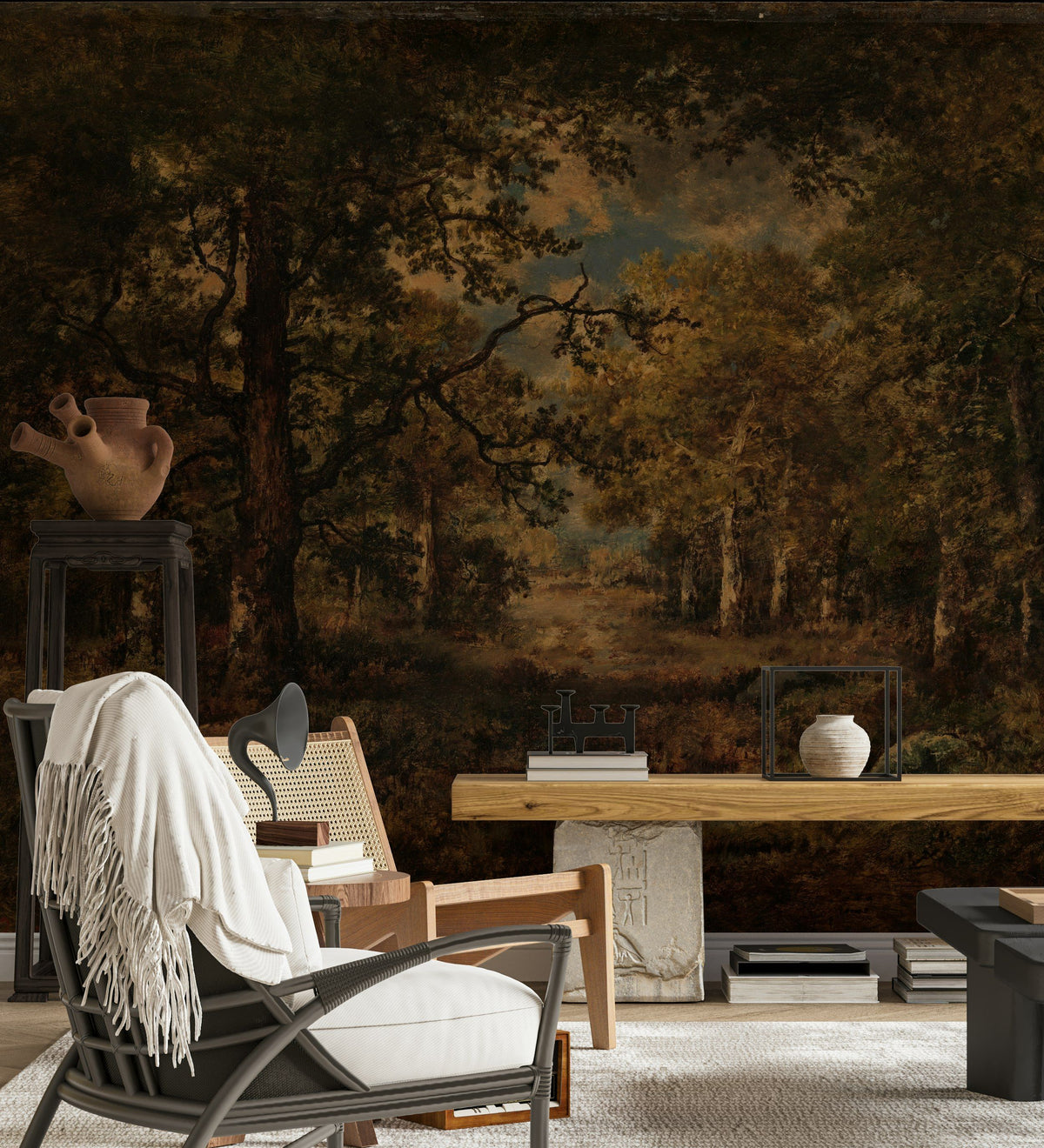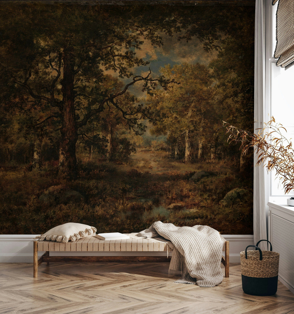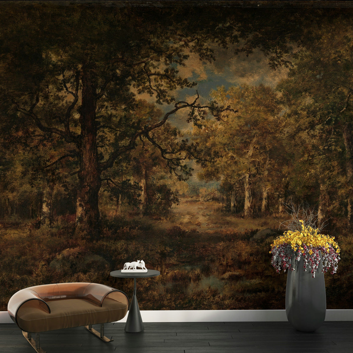 This wall mural features a moody forest landscape rendered with rich, earthy tones. The intricate details of the trees and foliage create a deep, immersive scene, perfect for adding a touch of nature’s tranquility to any space. Ideal for living rooms or bedrooms, the dark tones evoke a sense of depth and warmth, making it a great choice for rooms where comfort and relaxation are key. It pairs beautifully with rustic and traditional interiors, featuring natural wood furniture and earthy textiles.