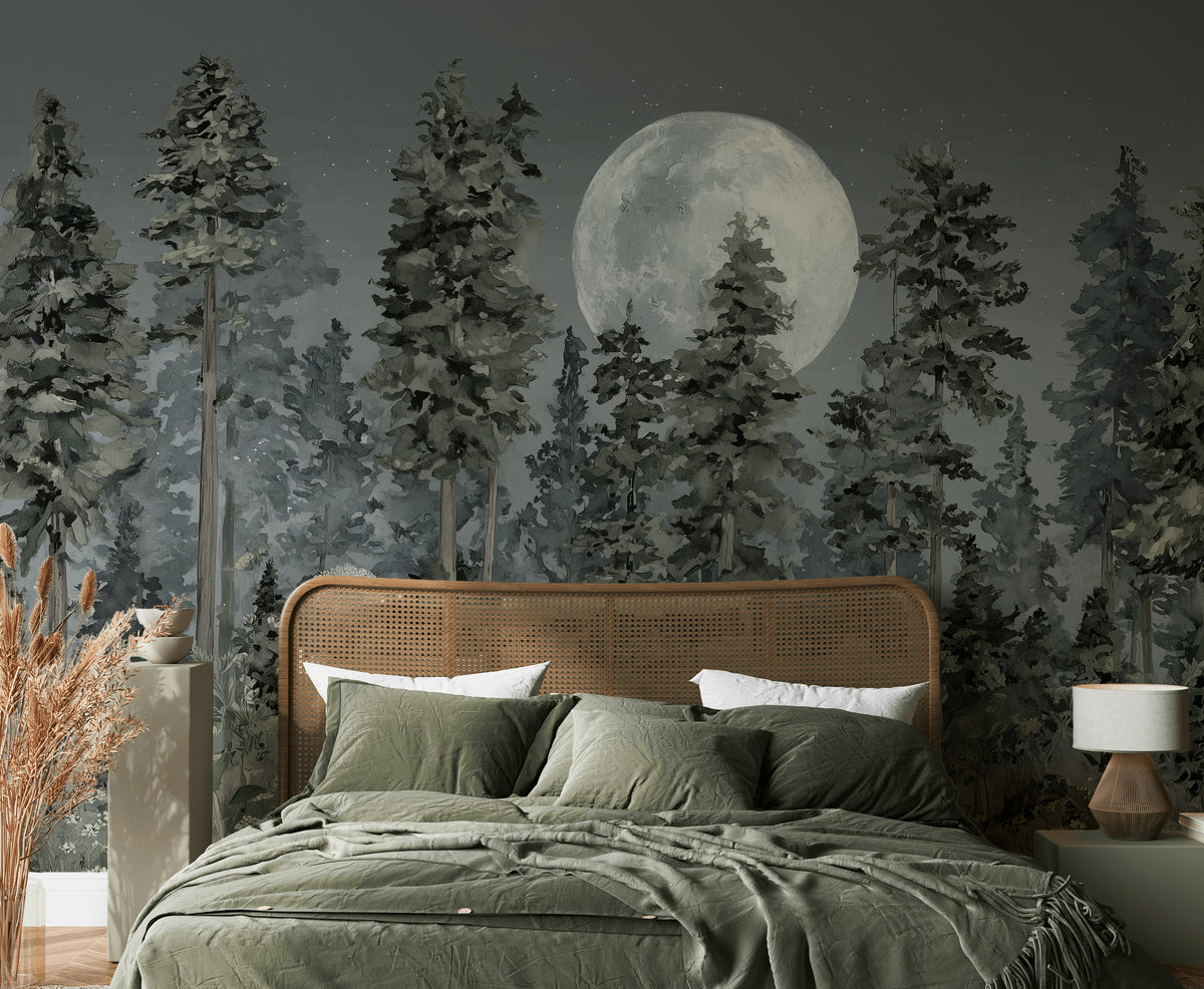 This watercolor mural shows a serene forest landscape with trees and wildflowers under a moonlit sky. The palette includes shades of green, gray, and white, creating a tranquil atmosphere.