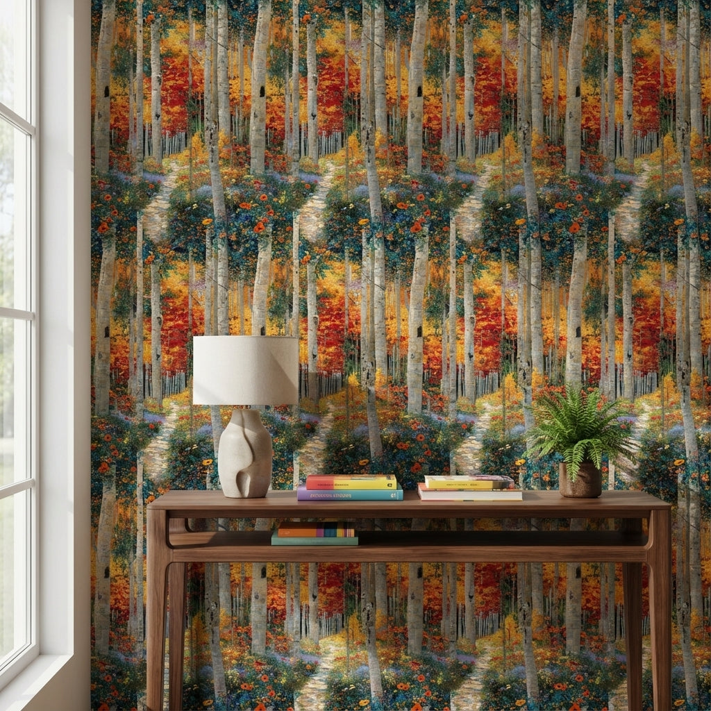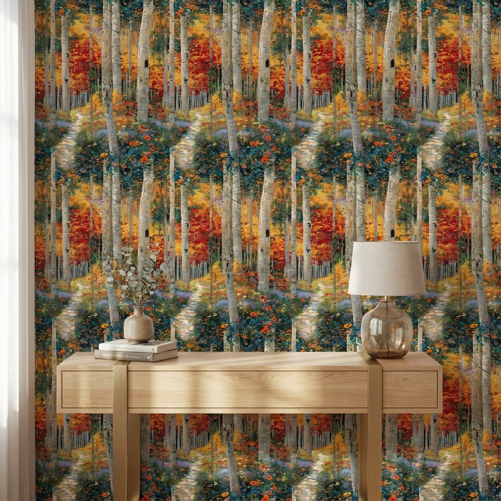 Immerse yourself in the rich colors of an autumn forest with this wallpaper, featuring vivid foliage and slender birch trees. This bold pattern is perfect for creating a lively feature wall in a living room or a serene backdrop in a bedroom. The colors play beautifully with natural light, adding depth and vibrancy. Suitable for rustic or modern interiors, it pairs well with wooden furniture and cozy textiles.