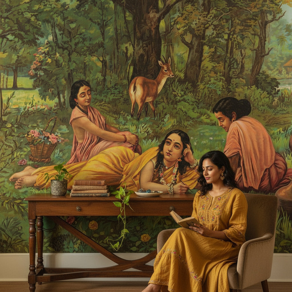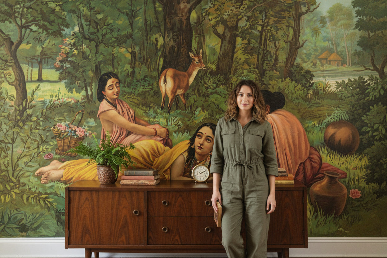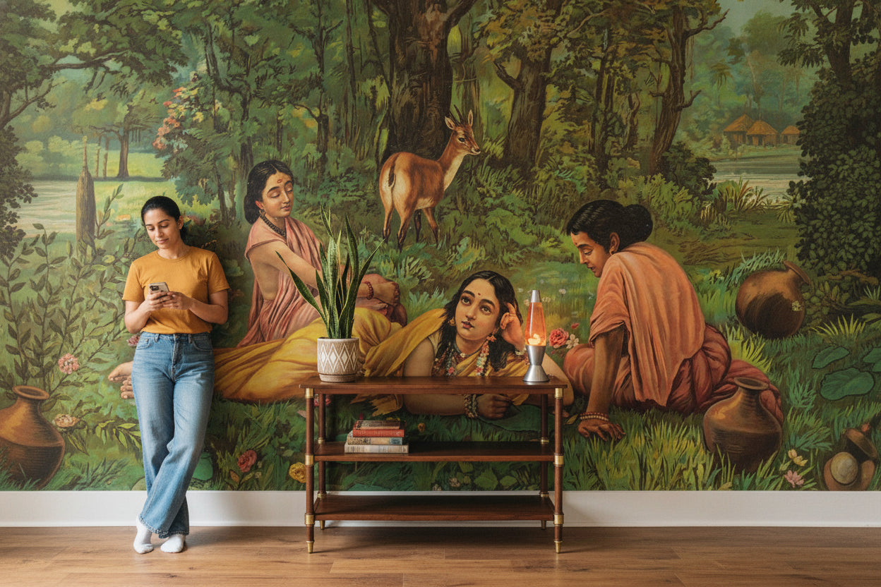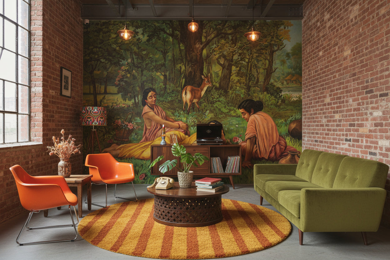 This mural includes trees, deer, and figures in a natural setting. The green and brown tones with floral elements highlight a traditional style. It works beautifully as vintage decor with a peaceful ambiance.