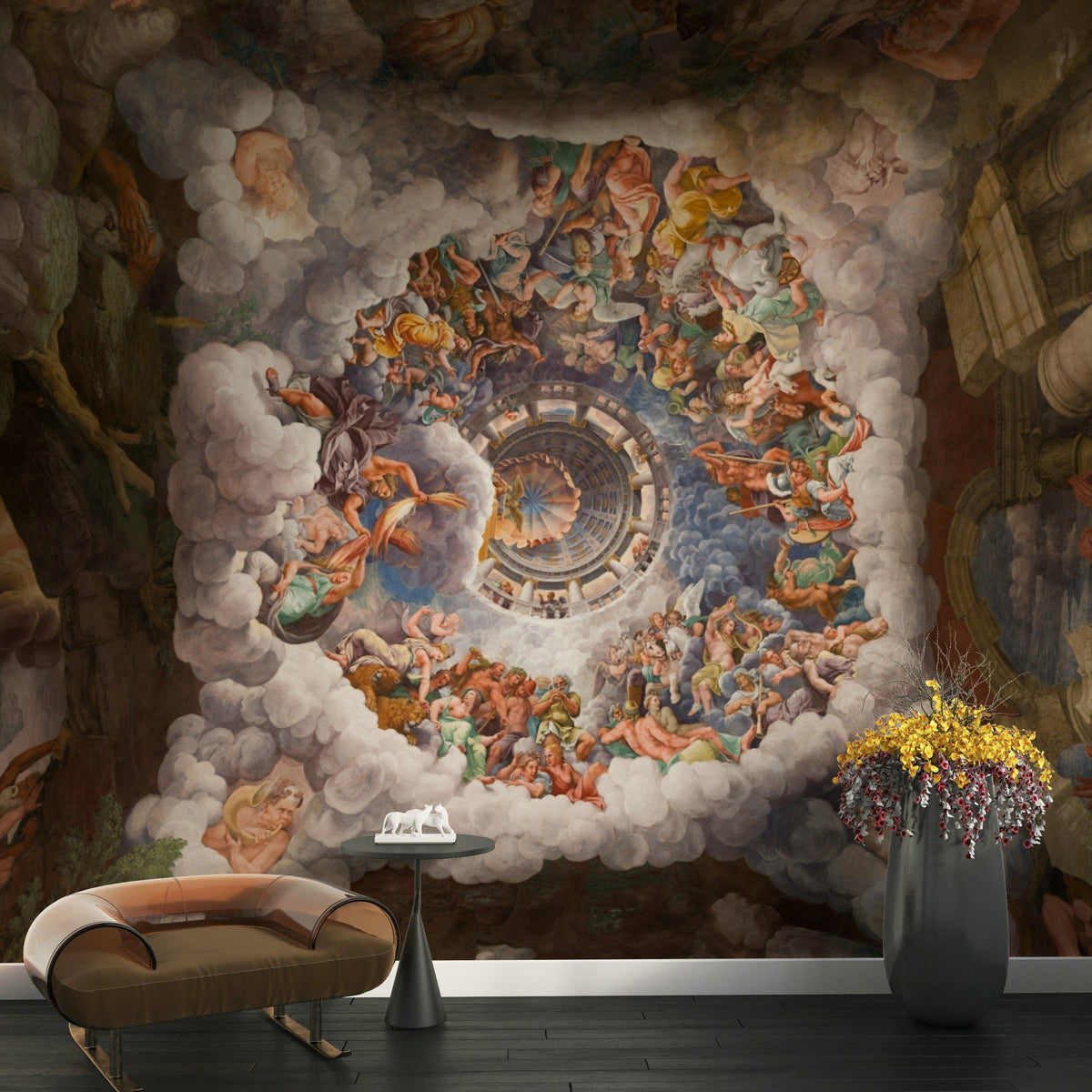 The Baroque fantasy theme of this mural complements luxury interior styles by incorporating a rich and dynamic design reminiscent of classic ceiling frescoes. Its vibrant portrayal of celestial beings and swirling clouds adds an element of grandeur and sophistication to any room.