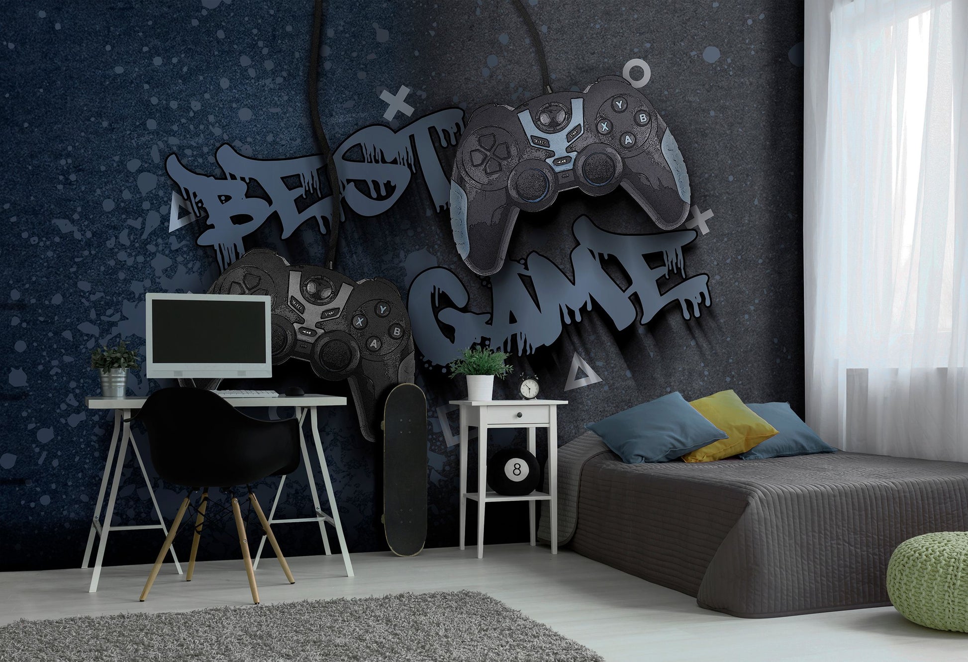 This wall mural highlights two black controllers with graffiti-style lettering reading “Best Game” across a textured dark blue surface. Designed in an urban spray-paint style, it captures gaming graffiti energy with console wallpaper detail. The look blends gamer wall art themes, arcade mural inspiration, and esports wallpaper influences. With bold controller mural graphics and dark gamer art tones, it makes a striking choice for modern gaming spaces.