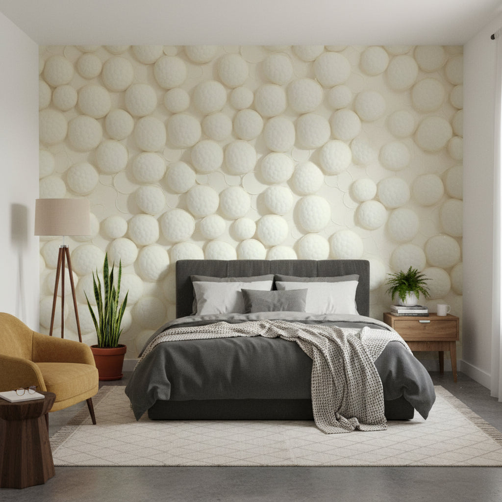 This modern wallpaper features abstract geometric shapes in ivory and white, creating a serene and minimalist aesthetic. The textured pattern adds depth, making it suitable for modern interiors.