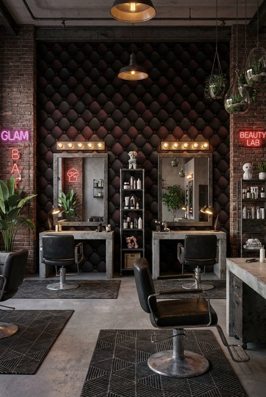 The quilted leather pattern of the Dark Burgundy Quilted Leather 3D Effect Wallpaper complements contemporary and industrial styles by adding depth and texture. Its rich color scheme and large-scale design enhance the room's visual interest while maintaining a chic and sophisticated look.