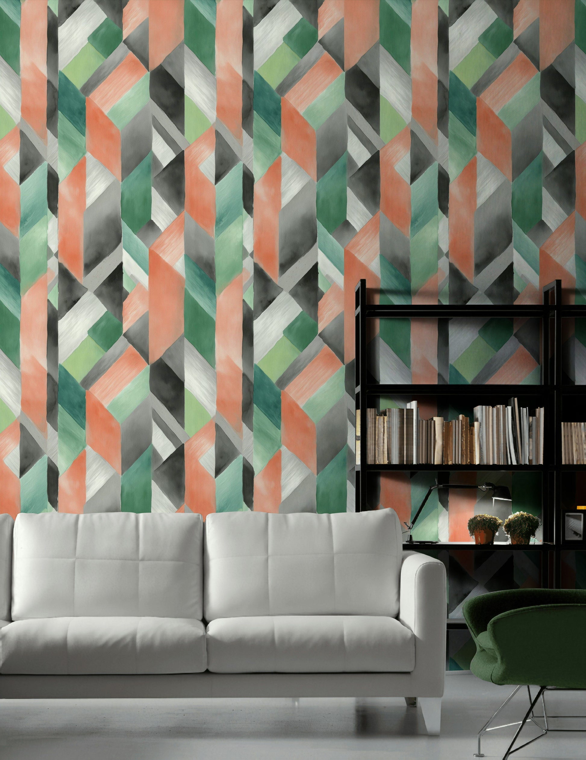 This modern wallpaper features a geometric watercolor pattern in coral, mint, and gray tones. The abstract prism design has a soft painted texture that brings depth and movement to walls. Printed with a matte finish, it complements contemporary and minimalist interiors. Ideal for creating a subtle wall art statement with geometric, pastel, and modern details.