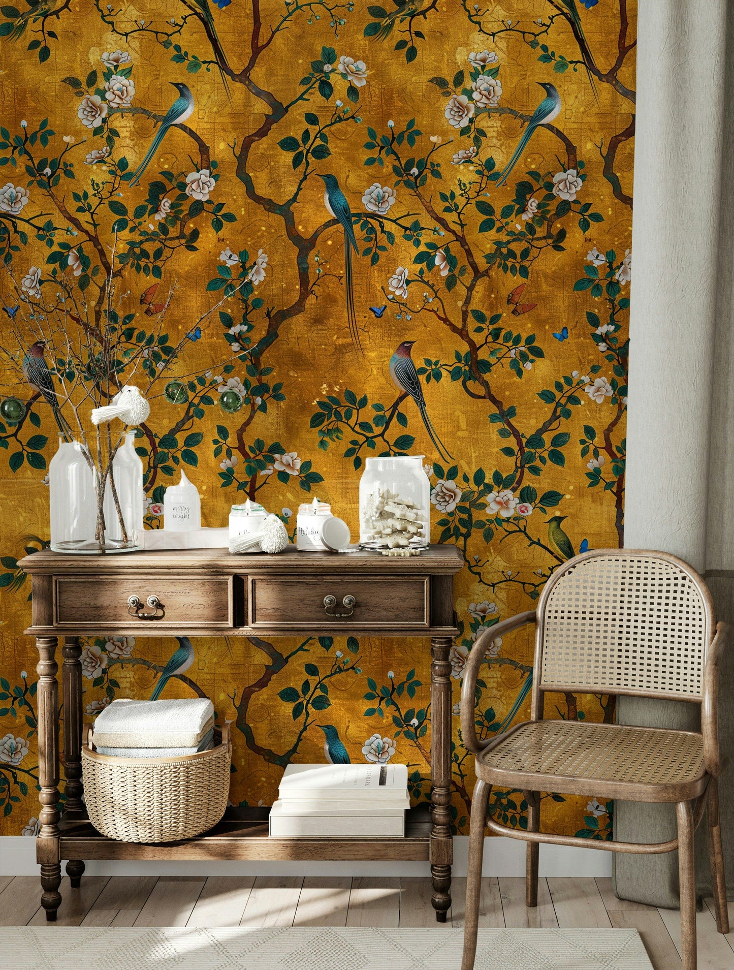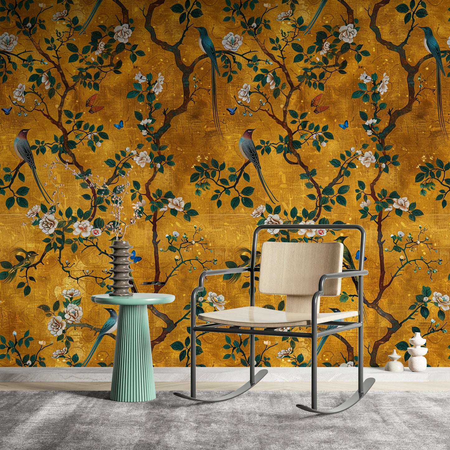 Elevate your home decor with this stunning botanical wallpaper featuring a rich golden background. This exquisite design showcases delicate white flowers, vibrant butterflies, and elegant birds perched on intertwining branches. The intricate details and luxurious colors create a captivating and sophisticated look, perfect for adding a touch of nature and artistry to any room.The wallpaper's hand-painted style and natural texture bring a sense of warmth and elegance, making it ideal for living rooms, bedrooms, or any space that seeks a blend of vintage charm and modern sophistication. This design captures the beauty of nature with a timeless aesthetic that enhances any interior.