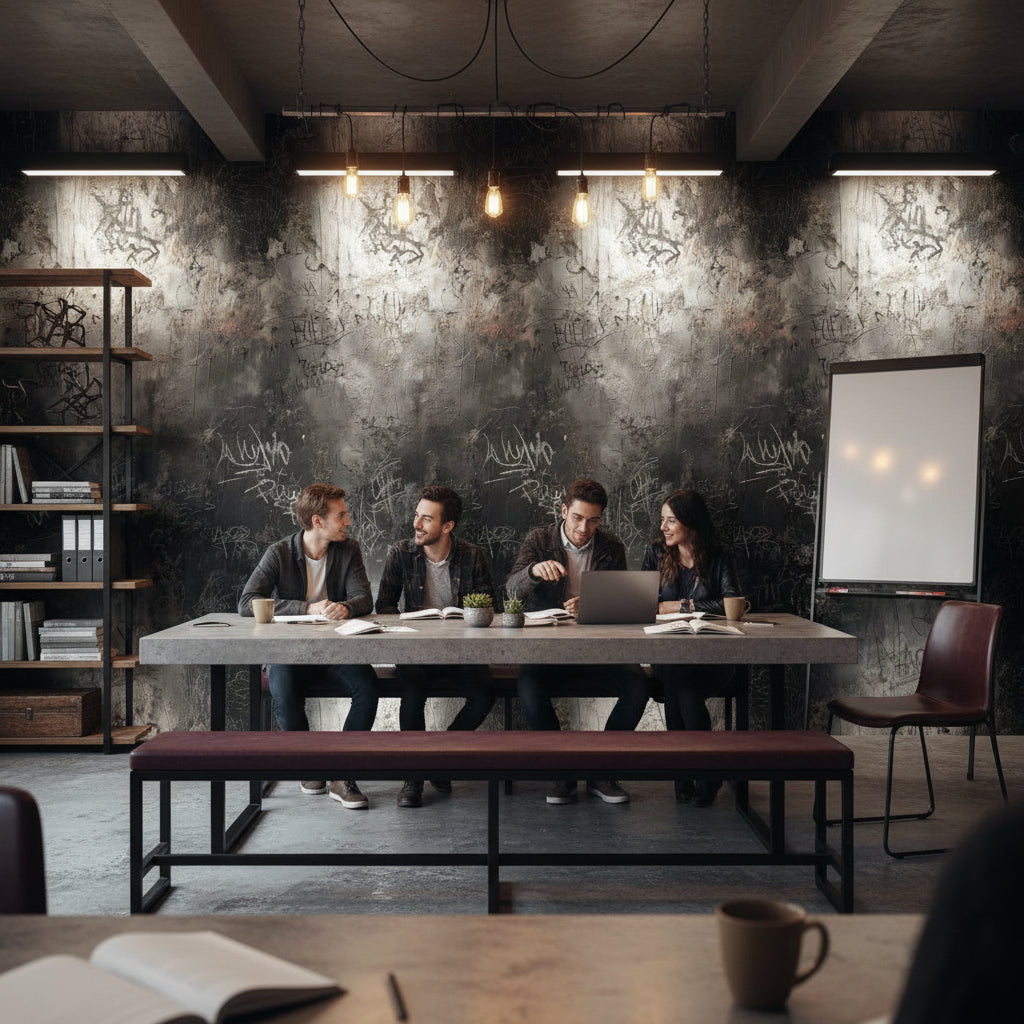 This urban mural shows black, gray, and red graffiti on a textured, industrial wall. The rustic design has a street art vibe that works in modern spaces.
