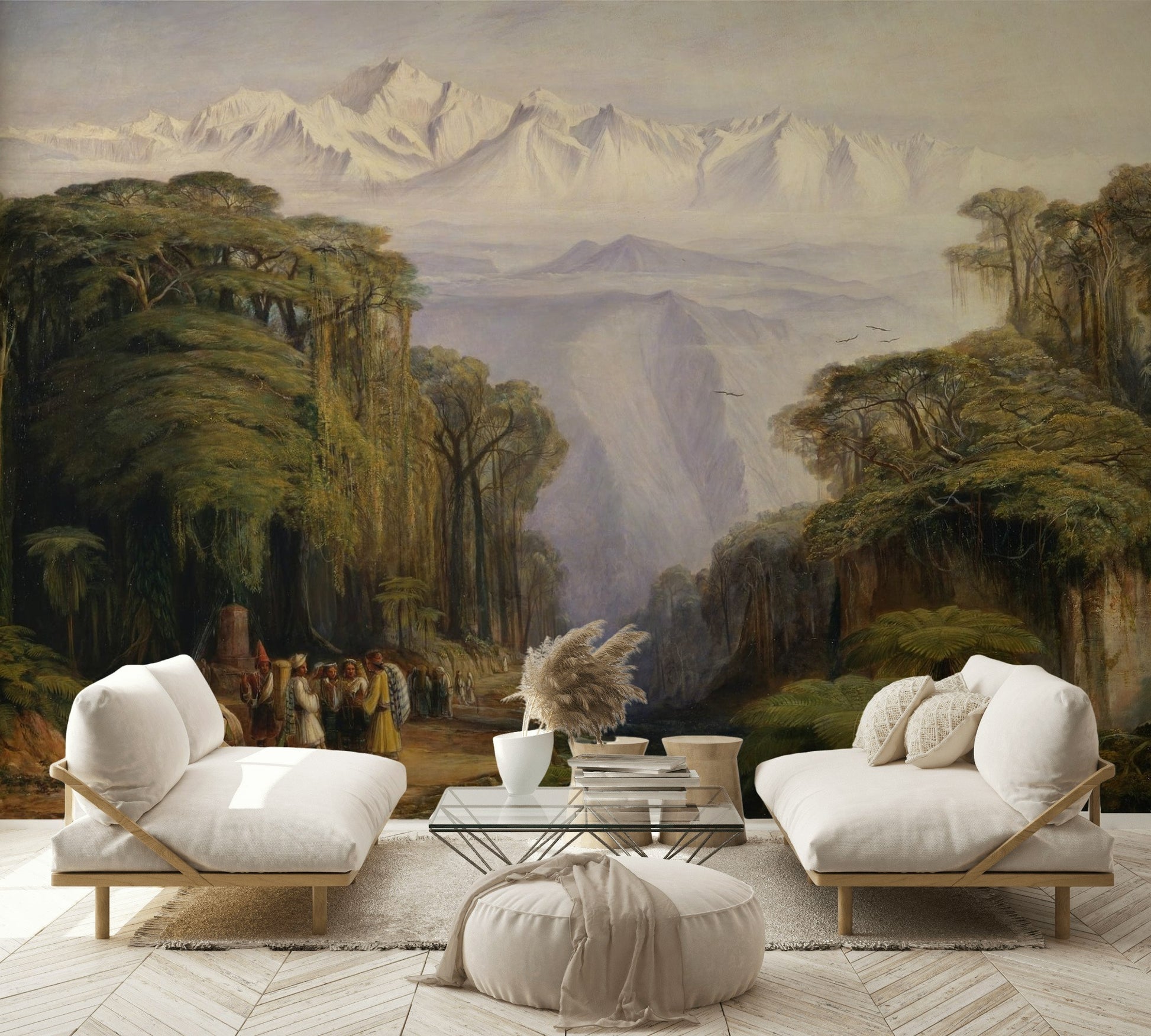 This wallpaper features a fantasy landscape mural inspired by misty mountains and dense green forest, with towering canopies and ancient paths leading through the jungle. Designed for nature lovers and explorers, the artwork includes a scenic view of Himalayan peaks and lush foliage. The mural brings together mountain mural inspiration, exotic jungle wallpaper, and landscape decor, making it a striking choice for those who appreciate travel wallpaper and adventure wall art. Subtle tones of green, white, and gray highlight the natural world for a space that feels immersive and timeless.