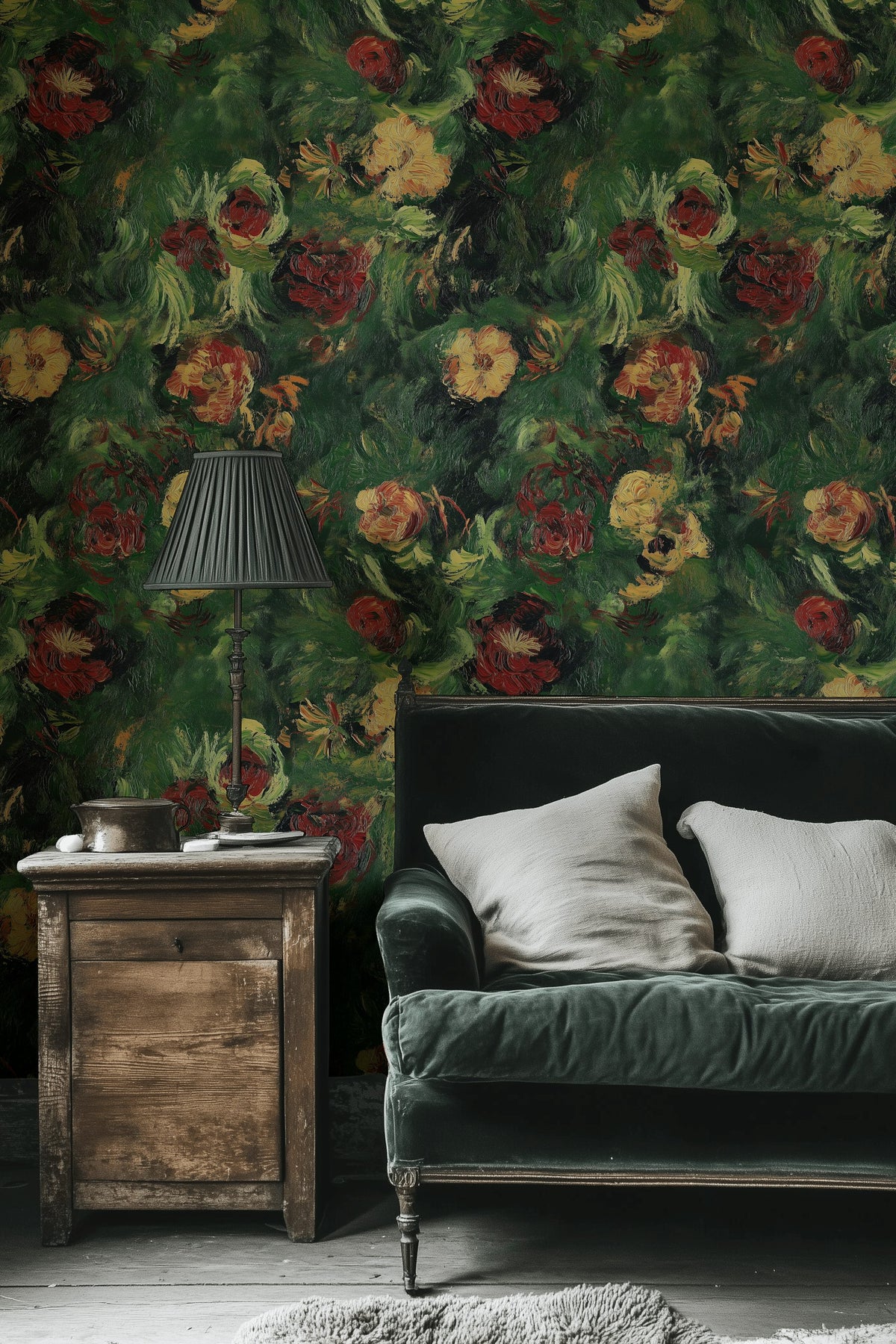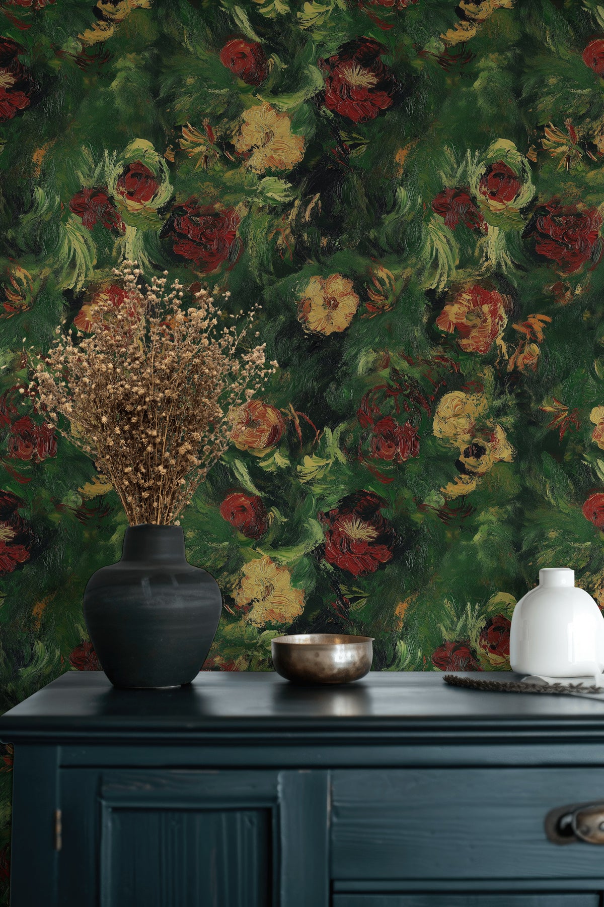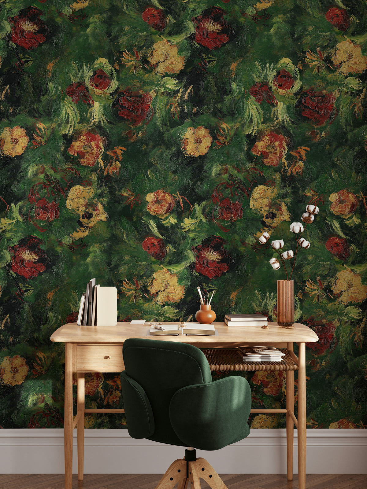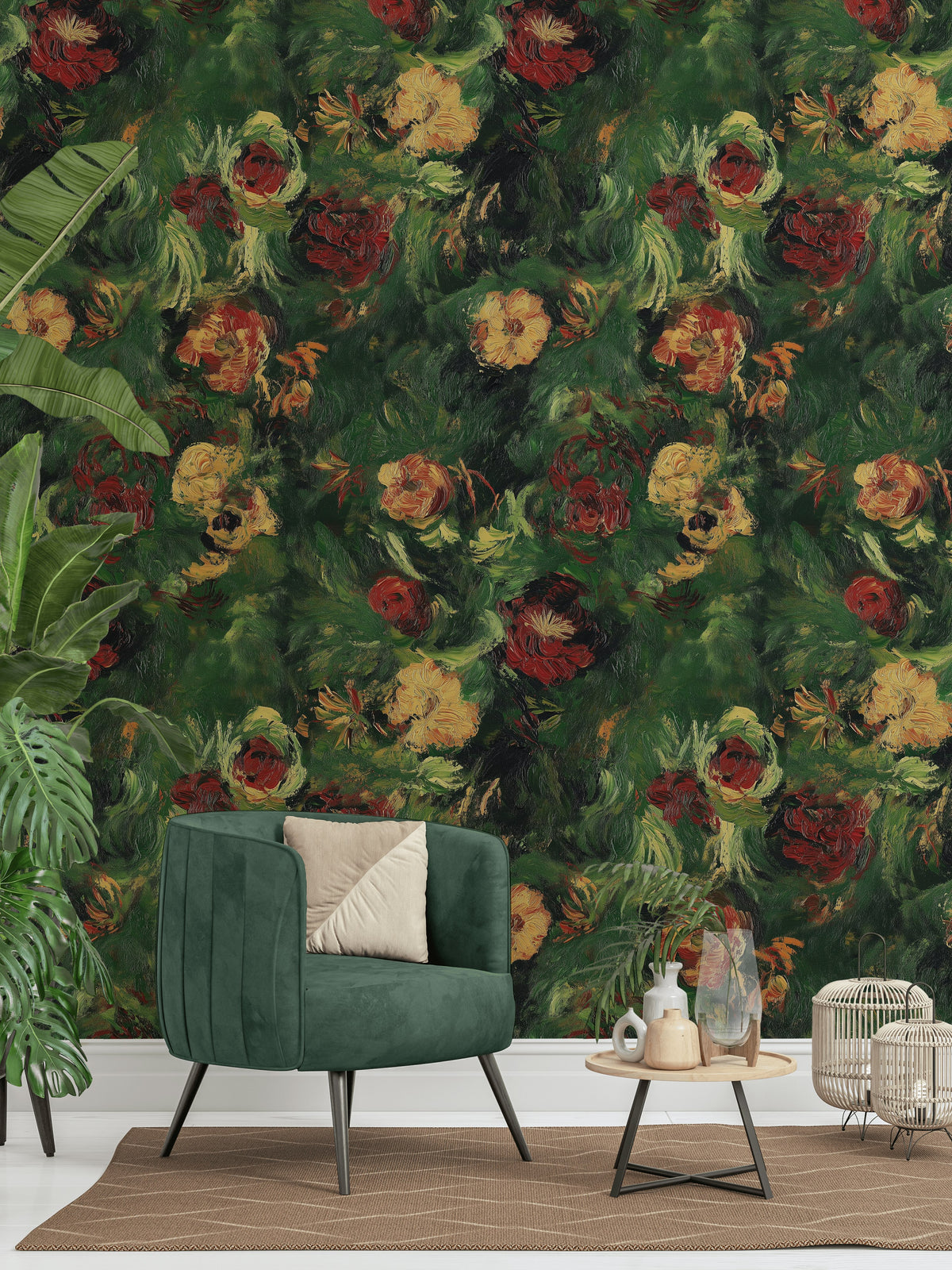 Bold roses in rich red and yellow tones weave through a deep green background, creating an artistic, painterly texture reminiscent of classic oil paintings. The dramatic floral design is ideal for creating a luxurious statement in living rooms and bedrooms, drawing the eye and inviting closer admiration.This wallpaper works excellently on feature walls, particularly behind a sofa or bed, enhancing the space with a touch of vintage elegance. Its intense colors absorb light to add warmth and depth