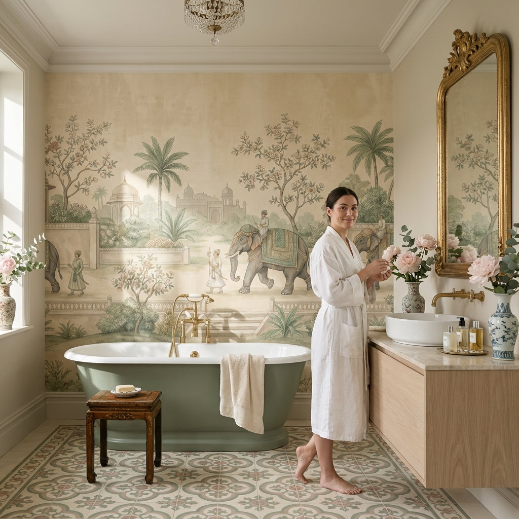 This elegant mural shows elephants in a traditional Indian procession with intricate architectural details. The vintage style and beige tones create a graceful decor element.